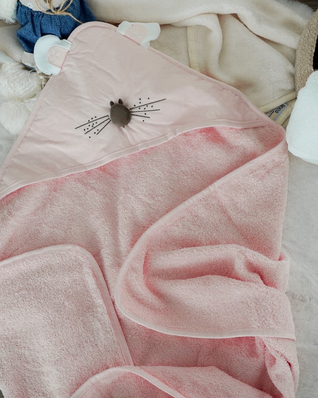 Accappatoio per neonati Vingi Ricami, il modello è a triangolo.Una tenerissima faccina da coniglietto in rilievo fa da cappuccio all’accappatoio.