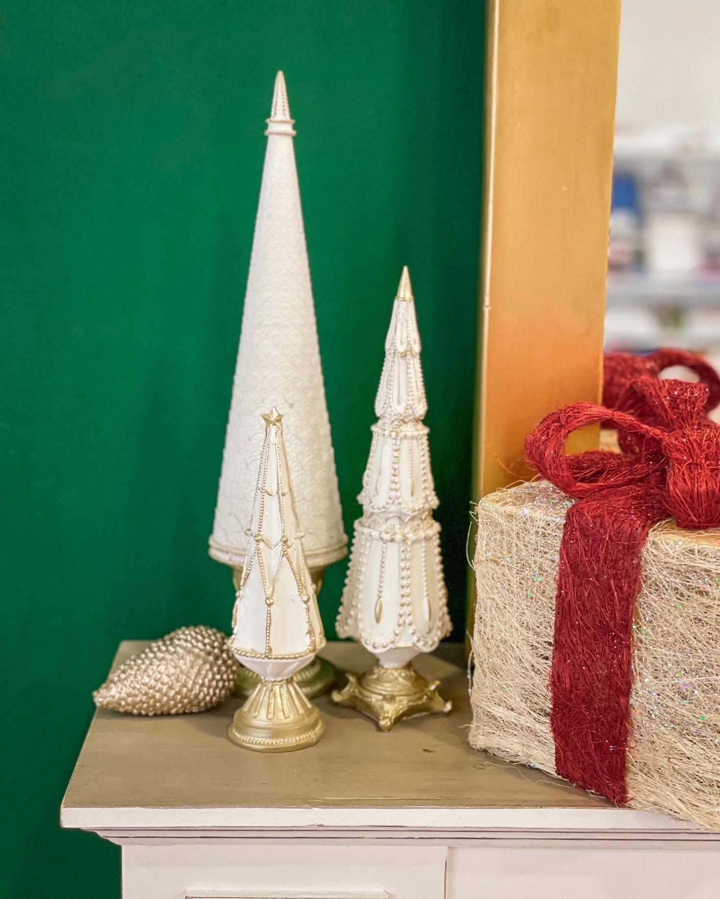 Alberi Ornamentali in Poliresina, bianchi e oro. Ideali per ambienti chic che non rinunciano alle atmosfere magiche natalizie. Acquistabili singolarmente.
