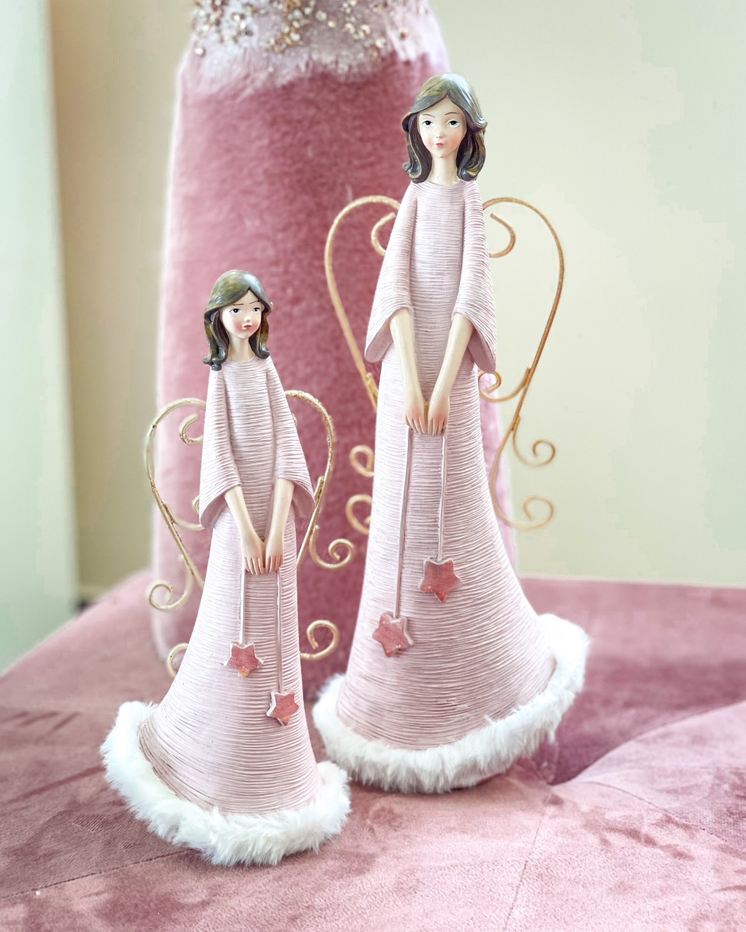 La delicatezza dei dettagli del suo vestitino rosa in ceramica simil costine, il morbido orletto il peluche bianco, il suo candido viso gentile, le grandi ali in metallo dorato e glitterato (che all’occorrenza si possono anche togliere) e le stelline in tinta più scura, fanno di questo Angioletto un prodotto unico nel suo genere che regalerà alle vostra case luce e amore.