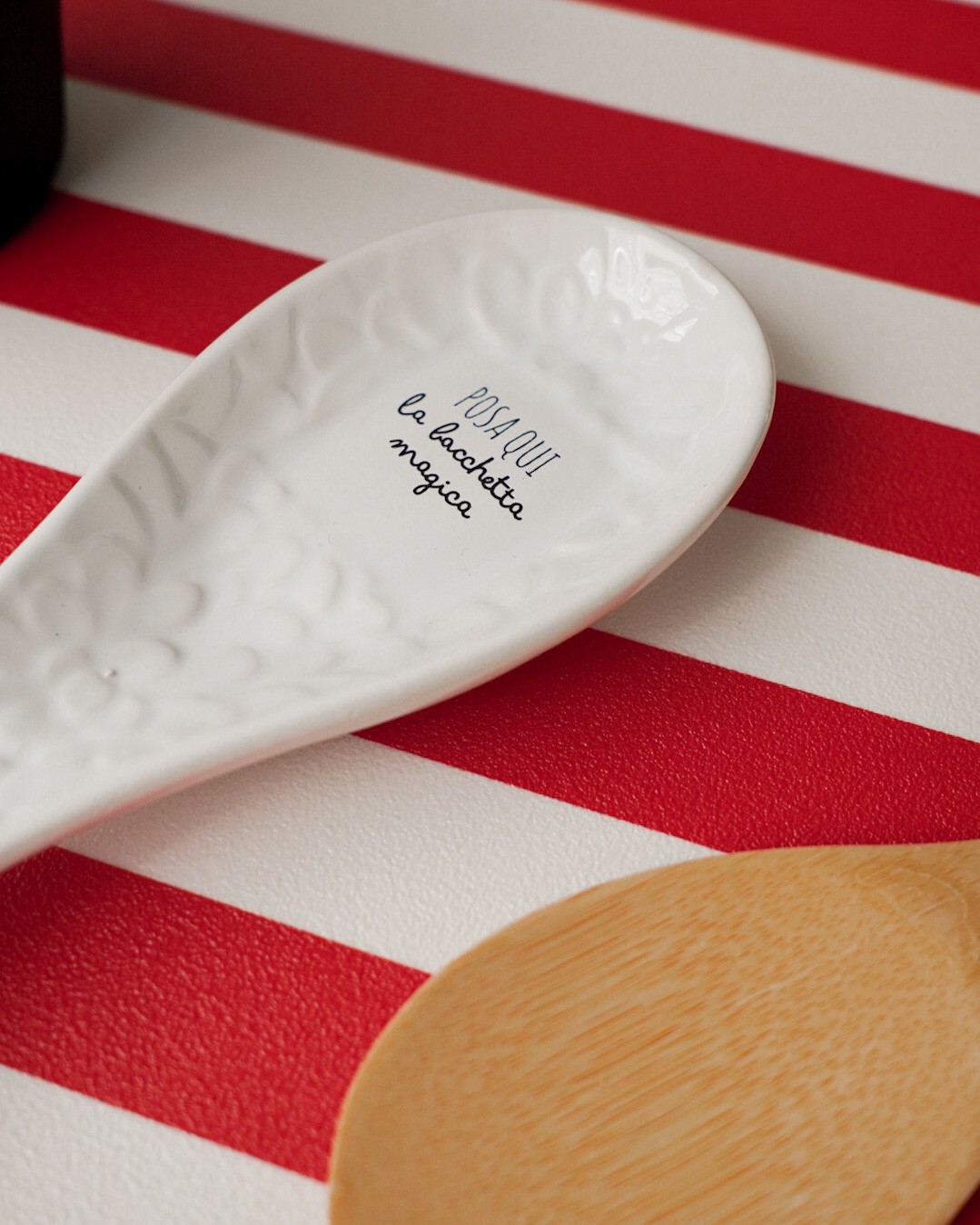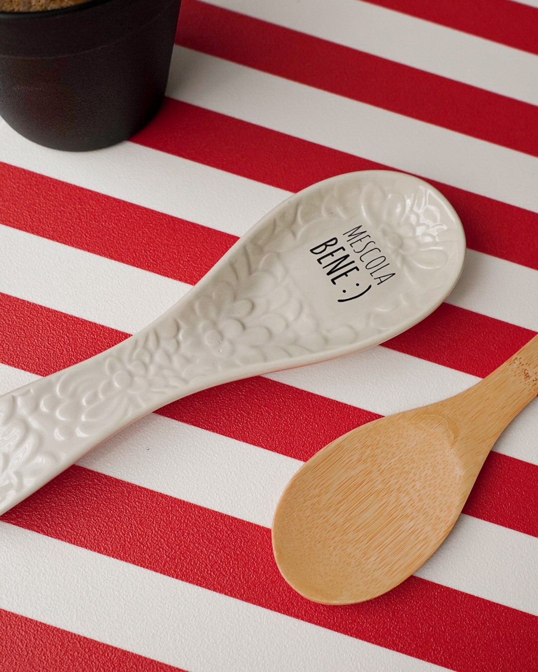 Poggia mestolo in ceramica con la possibilità di scegliere tra due simpatiche scritte e due varianti colore.