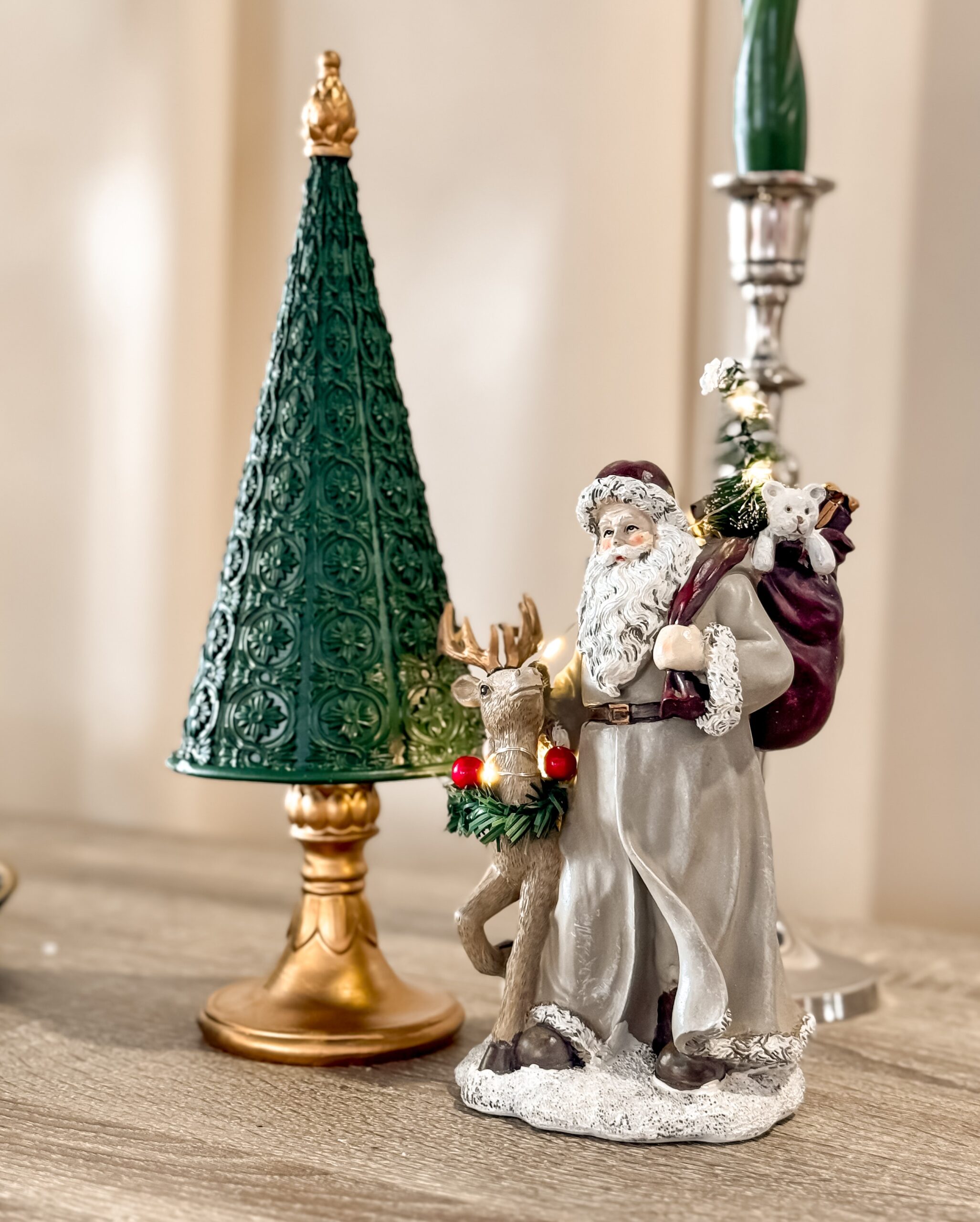 babbo natale decorativo, elegante, con sacco bordeaux e renna beige. Il babbo natale si illumina attraverso luci led che si azionano con un tastino On/Off sotto la base.ย