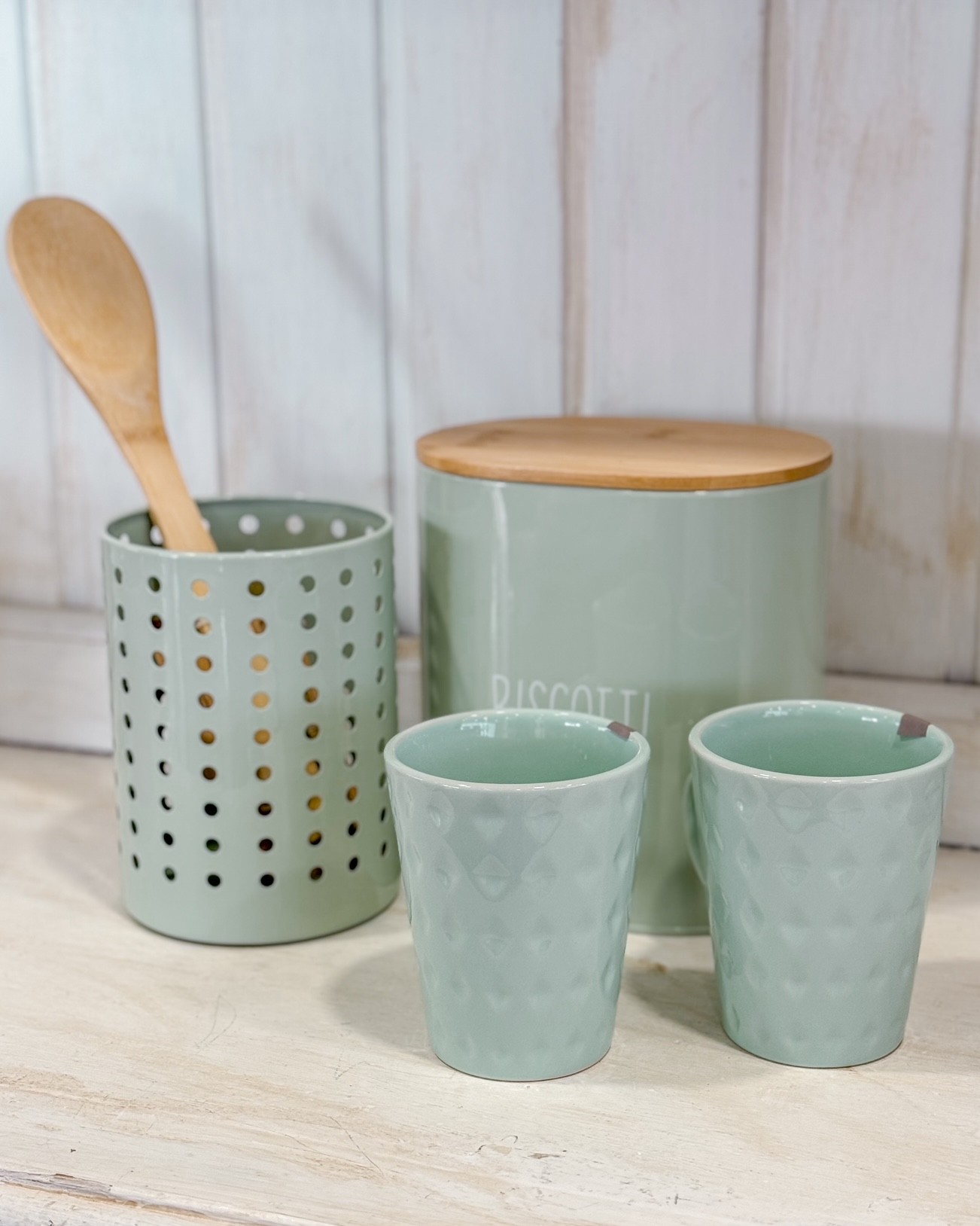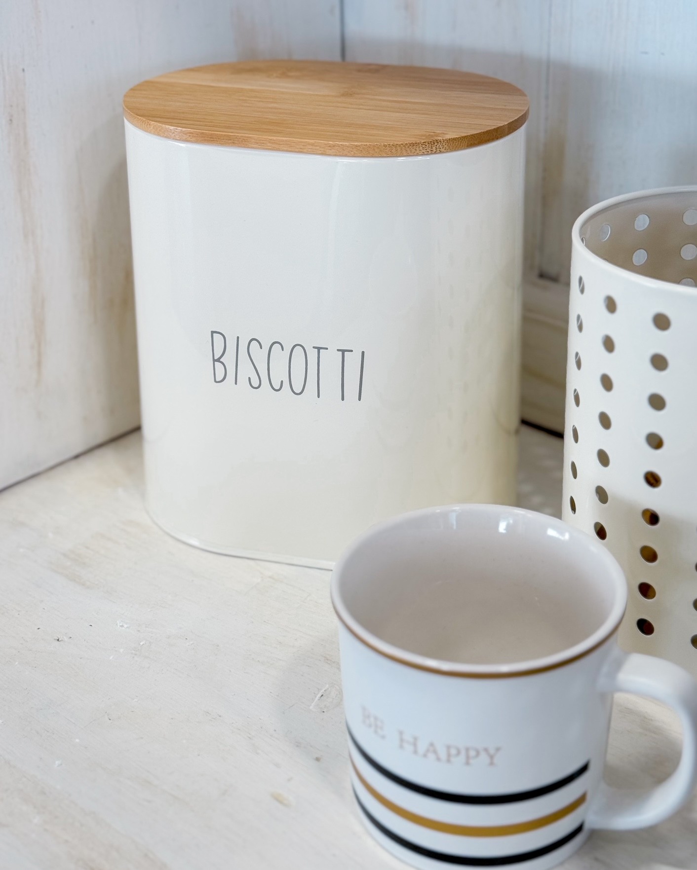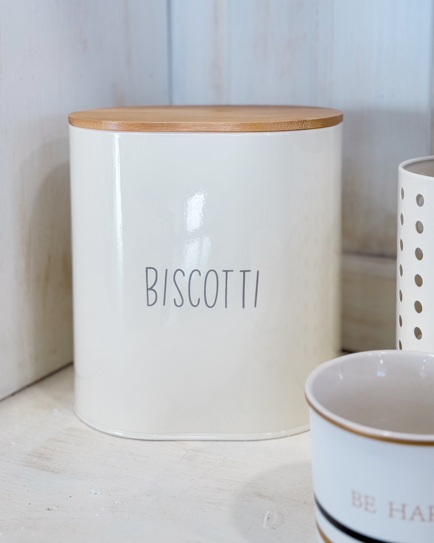 Contenitore Porta Biscotti in latta con tappo in legno ermetico, dotato di guarnizione. Disponibile in 3 varianti colore: un delicato meta, un panna o un grigio caldo. Sulla parte anteriore la scritta Biscotti.