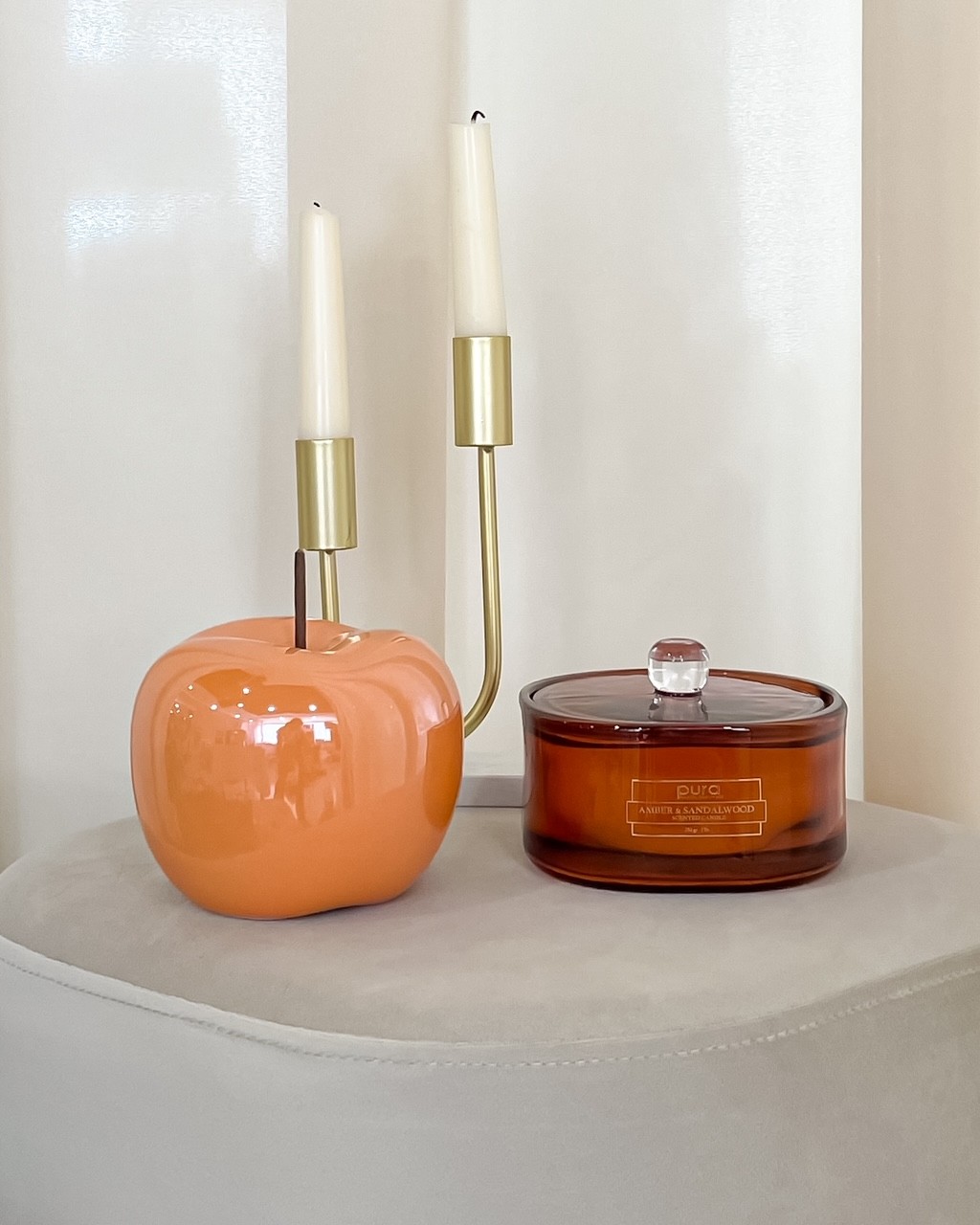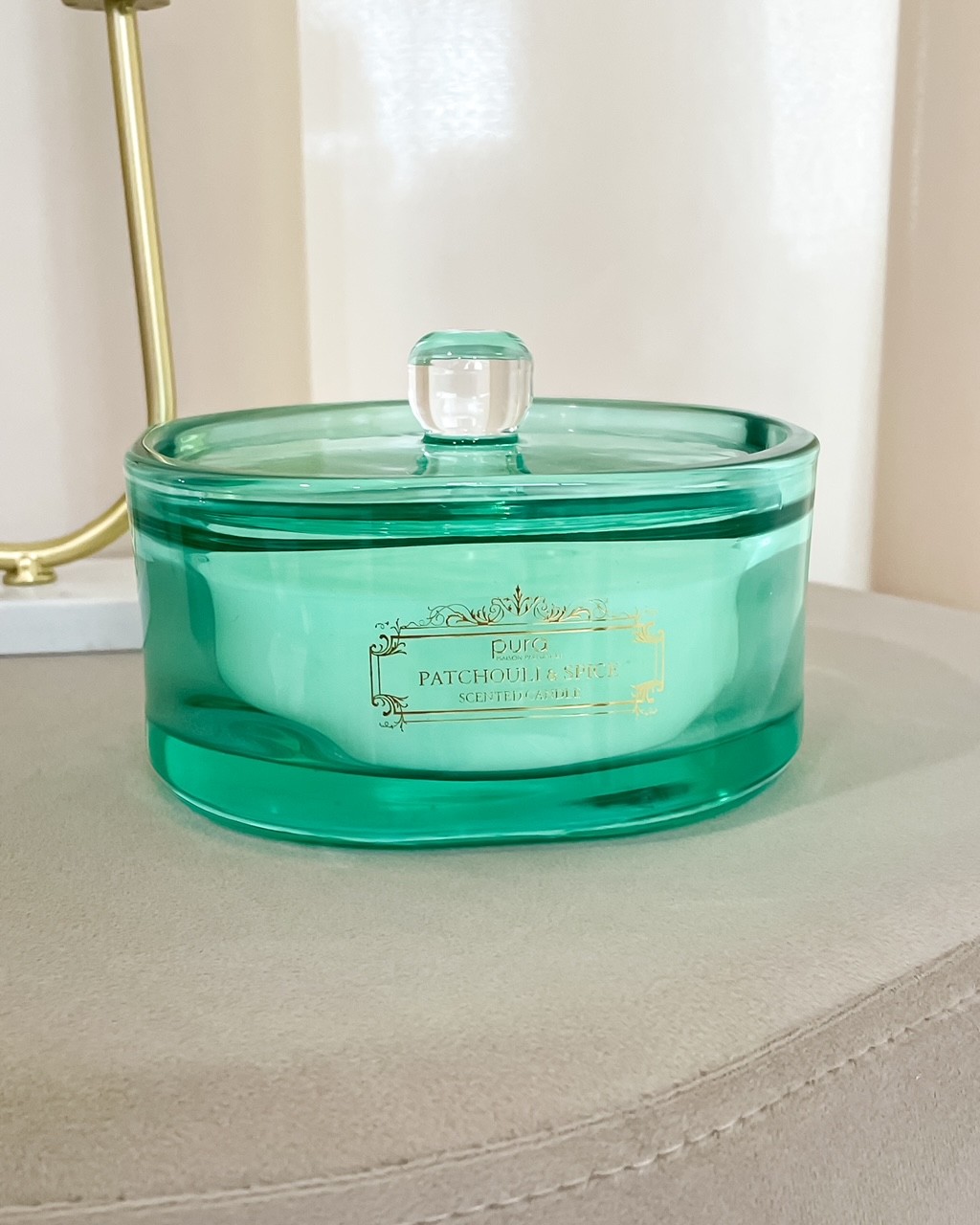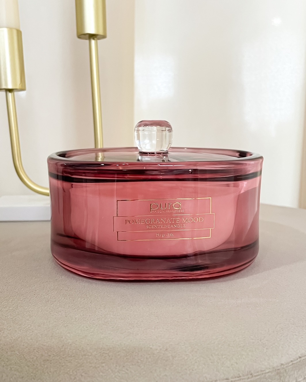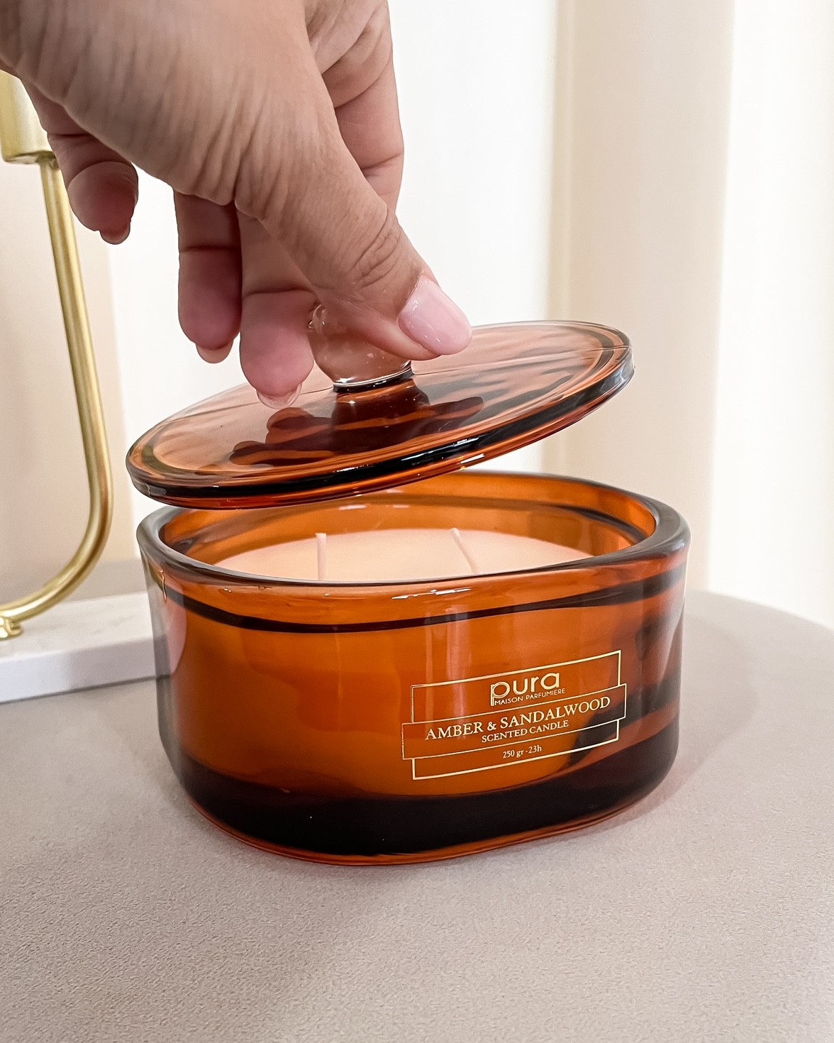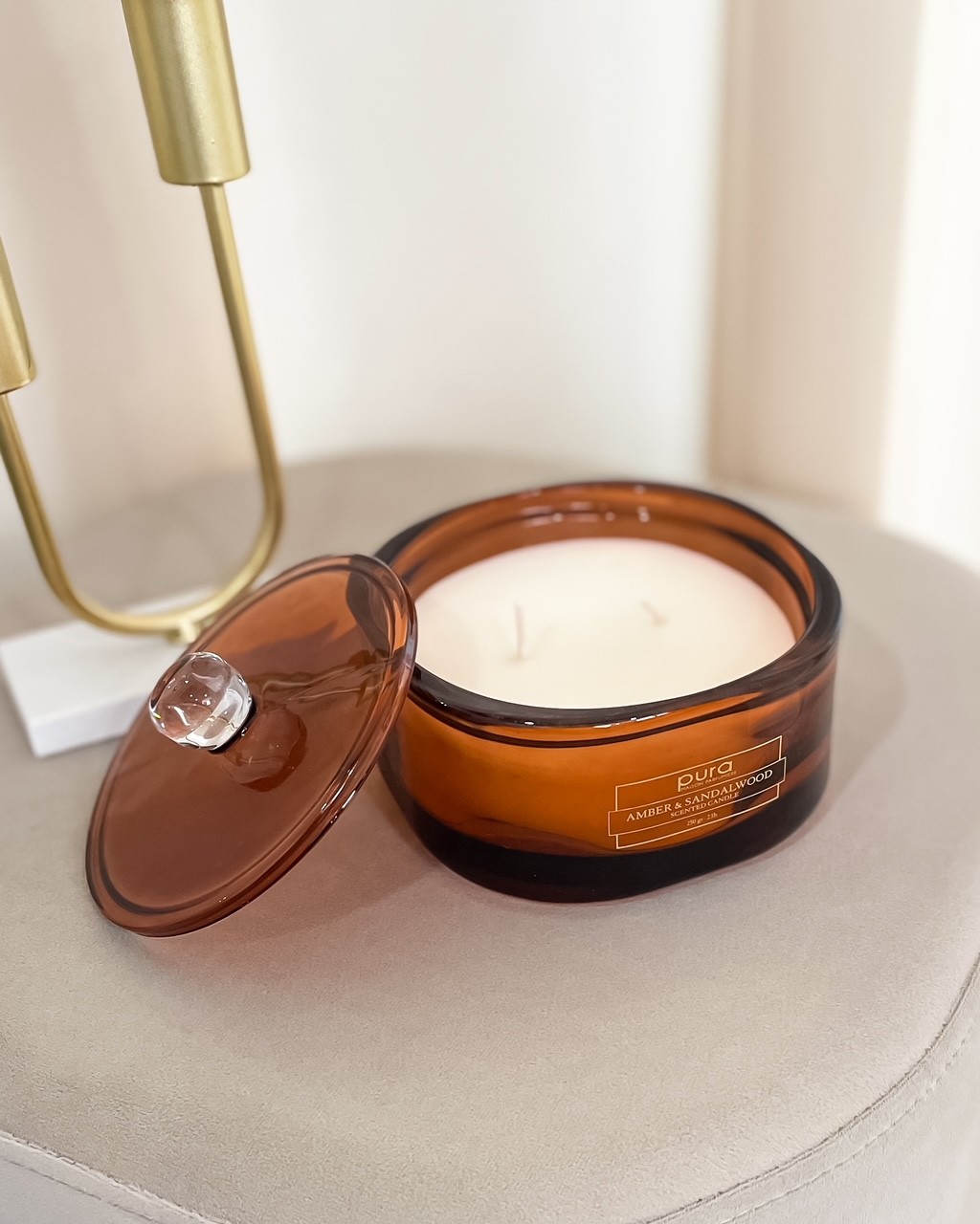 Candela profumata Pura, con cera bianca e due stoppini. Contenitore e coperchio in vetro colorato.