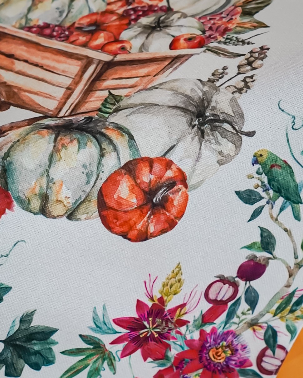 Centrotavola in Fantasia Autunnale con Zucca in Lino Grezzo 90×90 cm