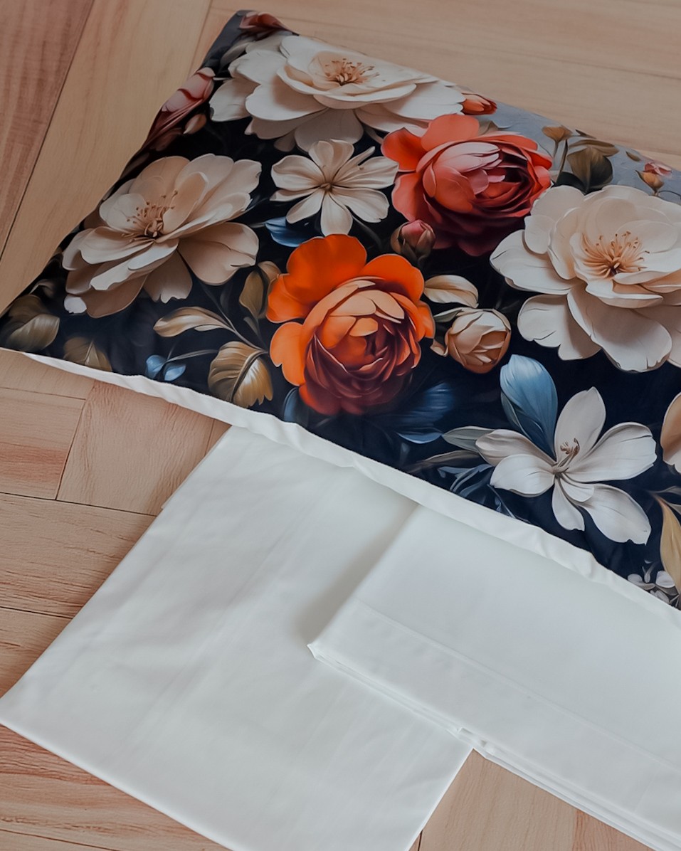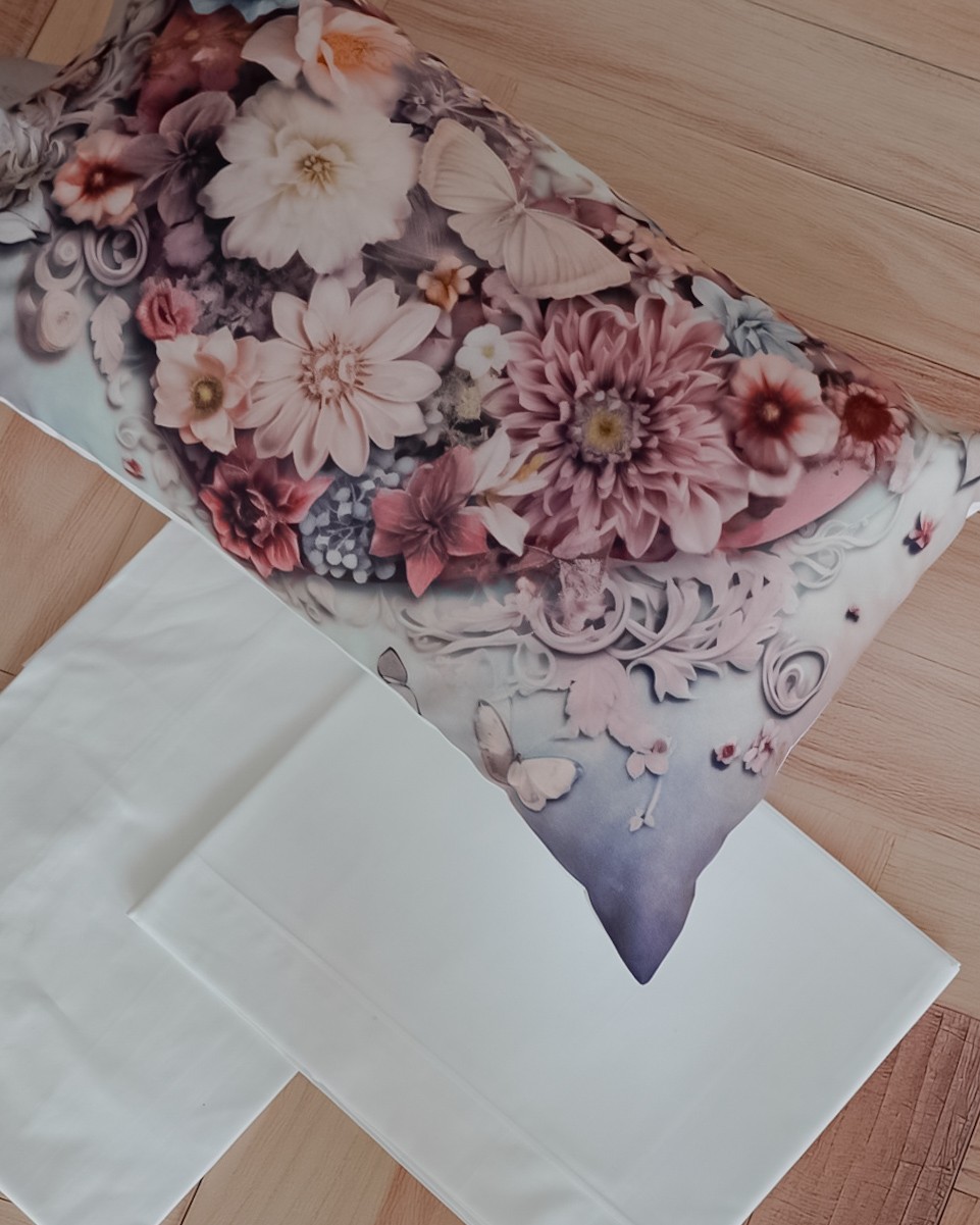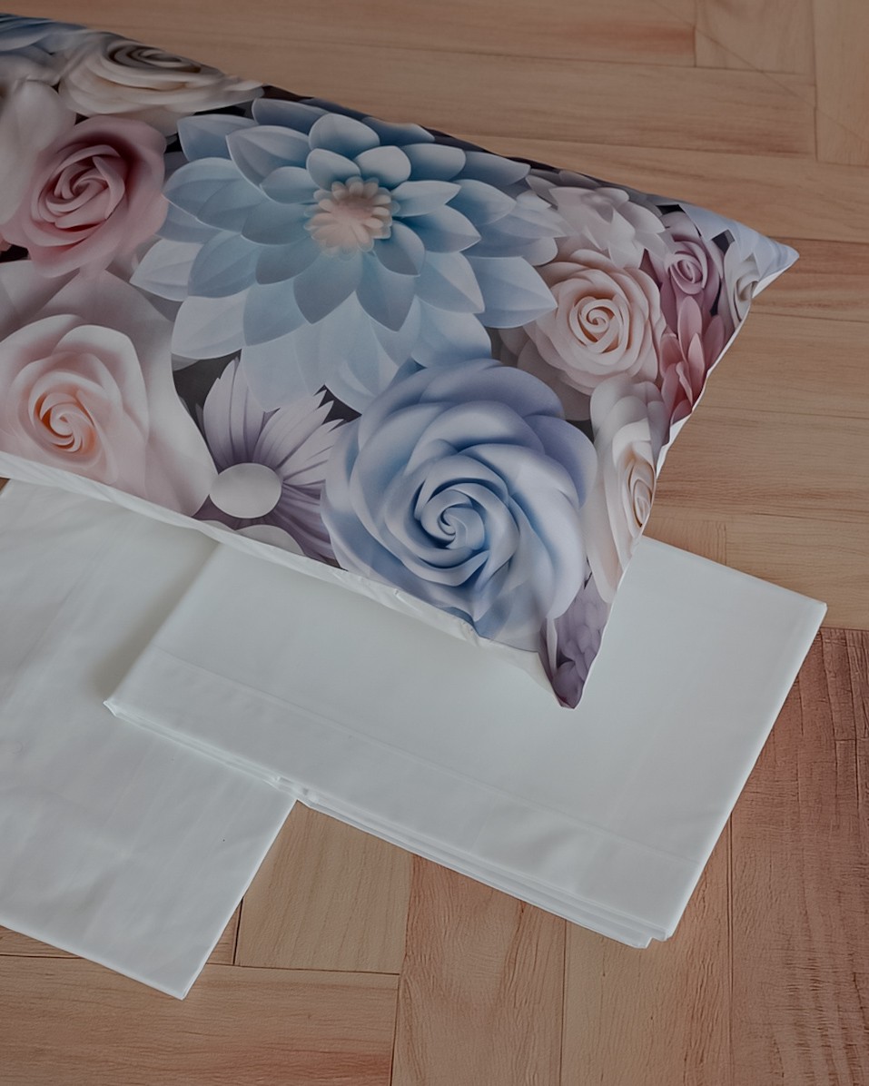 Il set comprende: lenzuolo sopra, lenzuolo sotto con angoli e 2 federe a sacchetto.