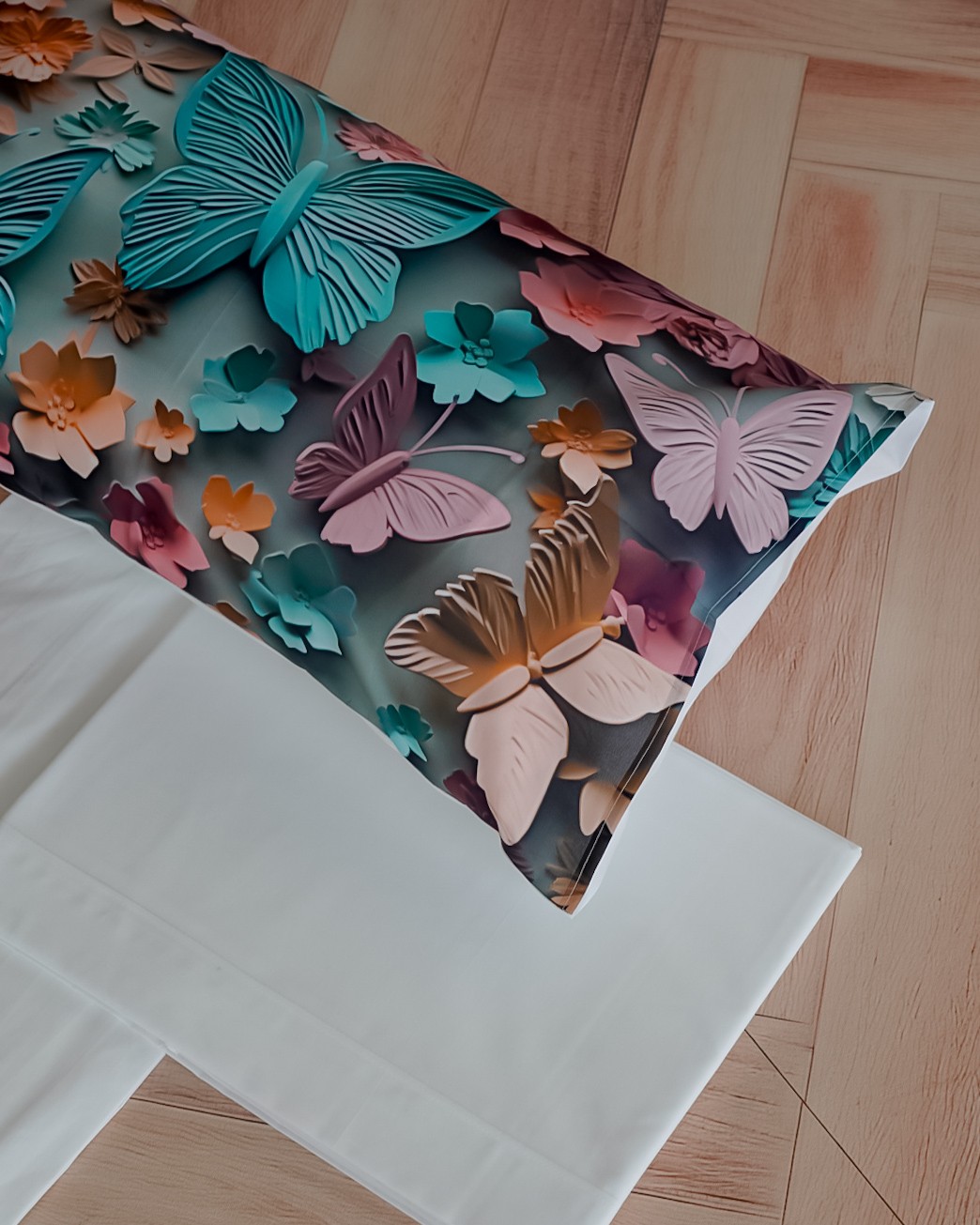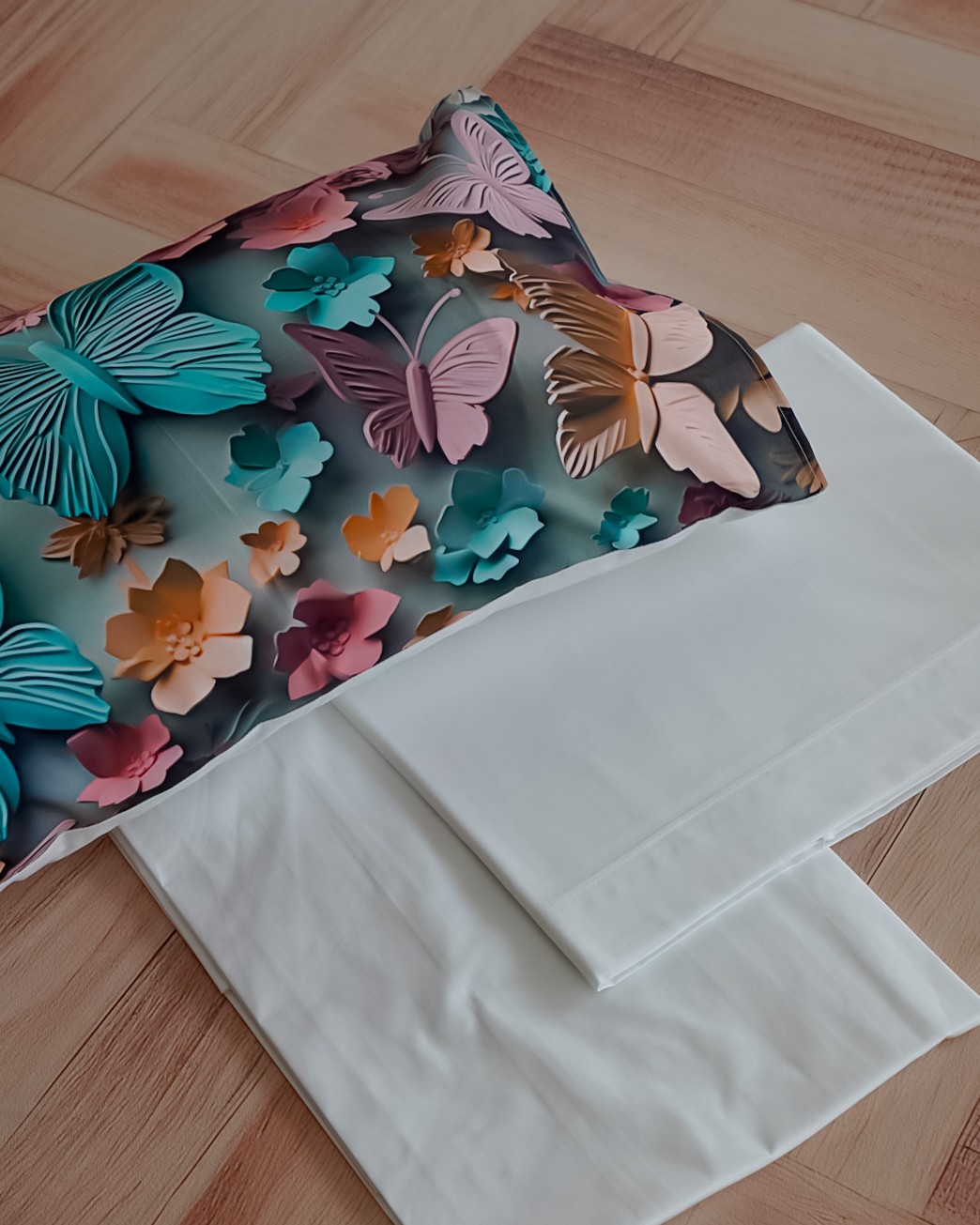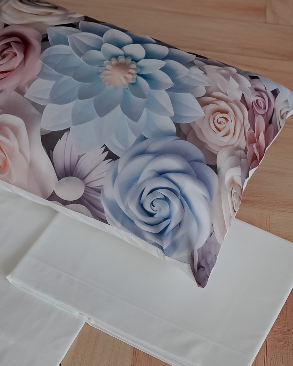 Il set comprende: lenzuolo sopra, lenzuolo sotto con angoli e 2 federe a sacchetto.