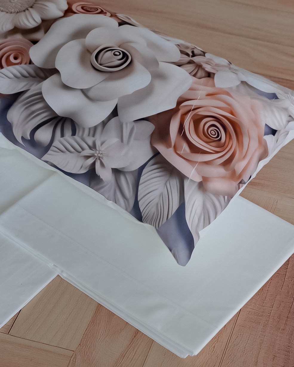 Questo completo lenzuola matrimoniali è di Nazareno Gabrielli, presenta un disegno floreale che caratterizza le federe, le federe sono a sacchetto. Il lenzuolo di sopra e il lenzuolo di sotto con angoli sono entrambi tinta unita nel colore bianco.