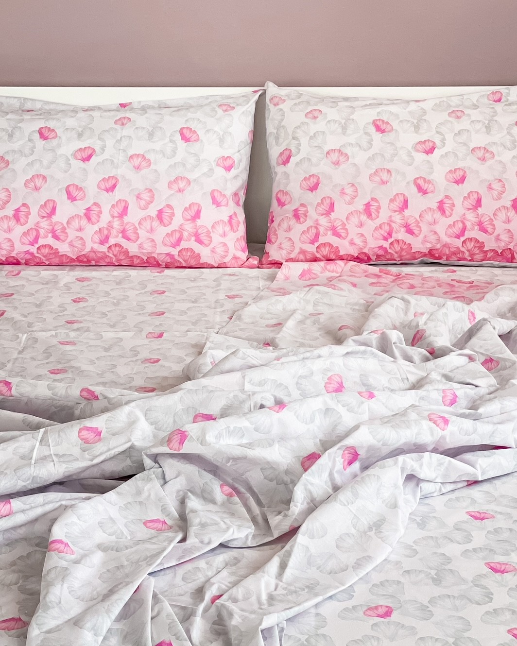 Il completo lenzuola della collezione Marena, di Biancaluna, è composto da due federe a sacchetto, un lenzuolo di sotto con angoli e un lenzuolo di sopra.