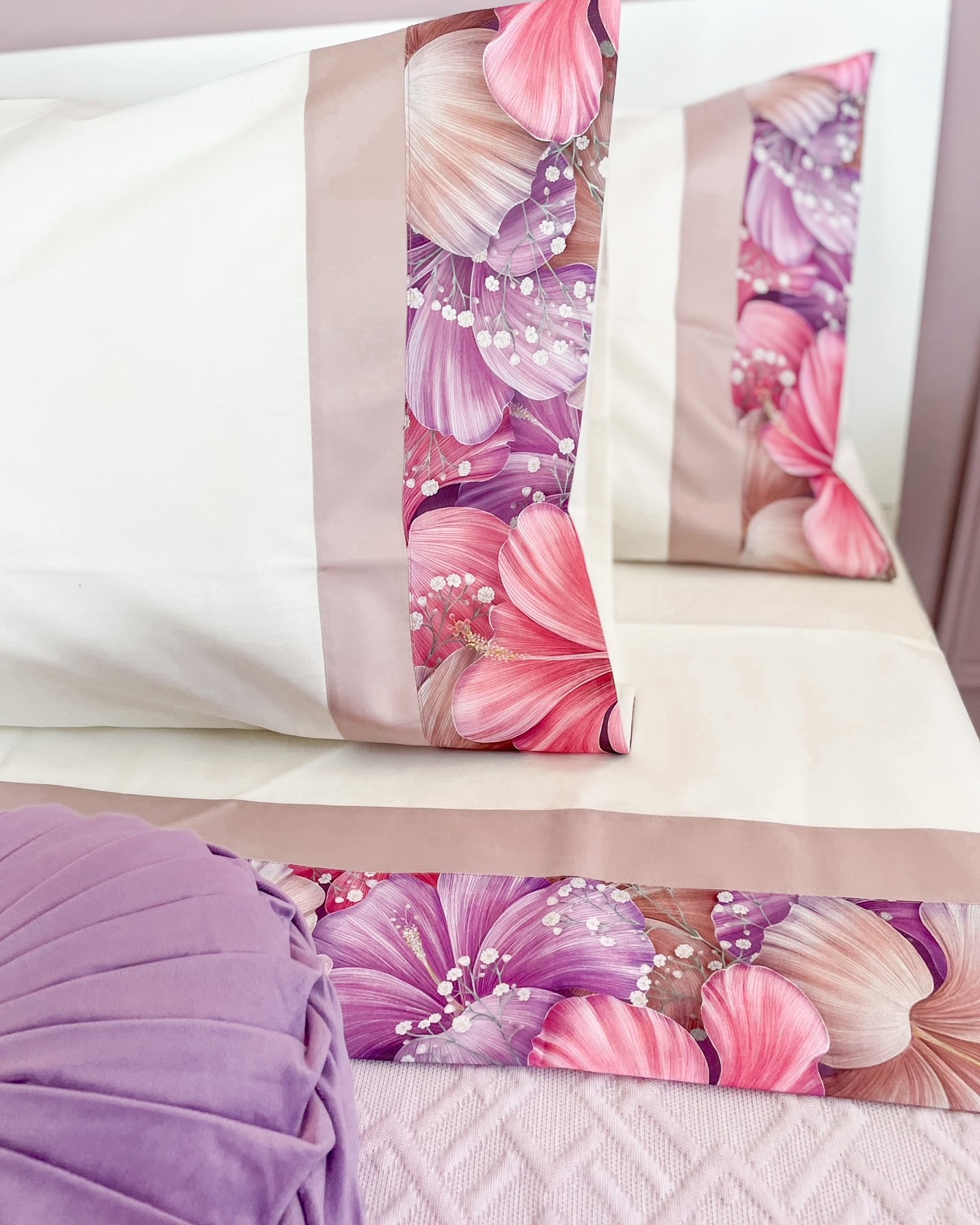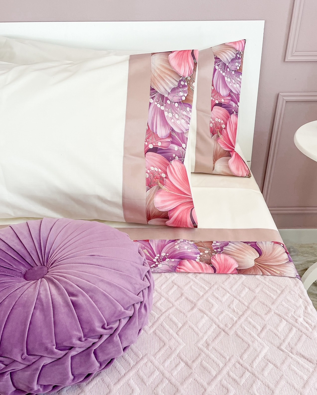 Il completo è in cotone e il set comprende: lenzuolo sopra, lenzuolo sotto e 2 federe a sacchetto.