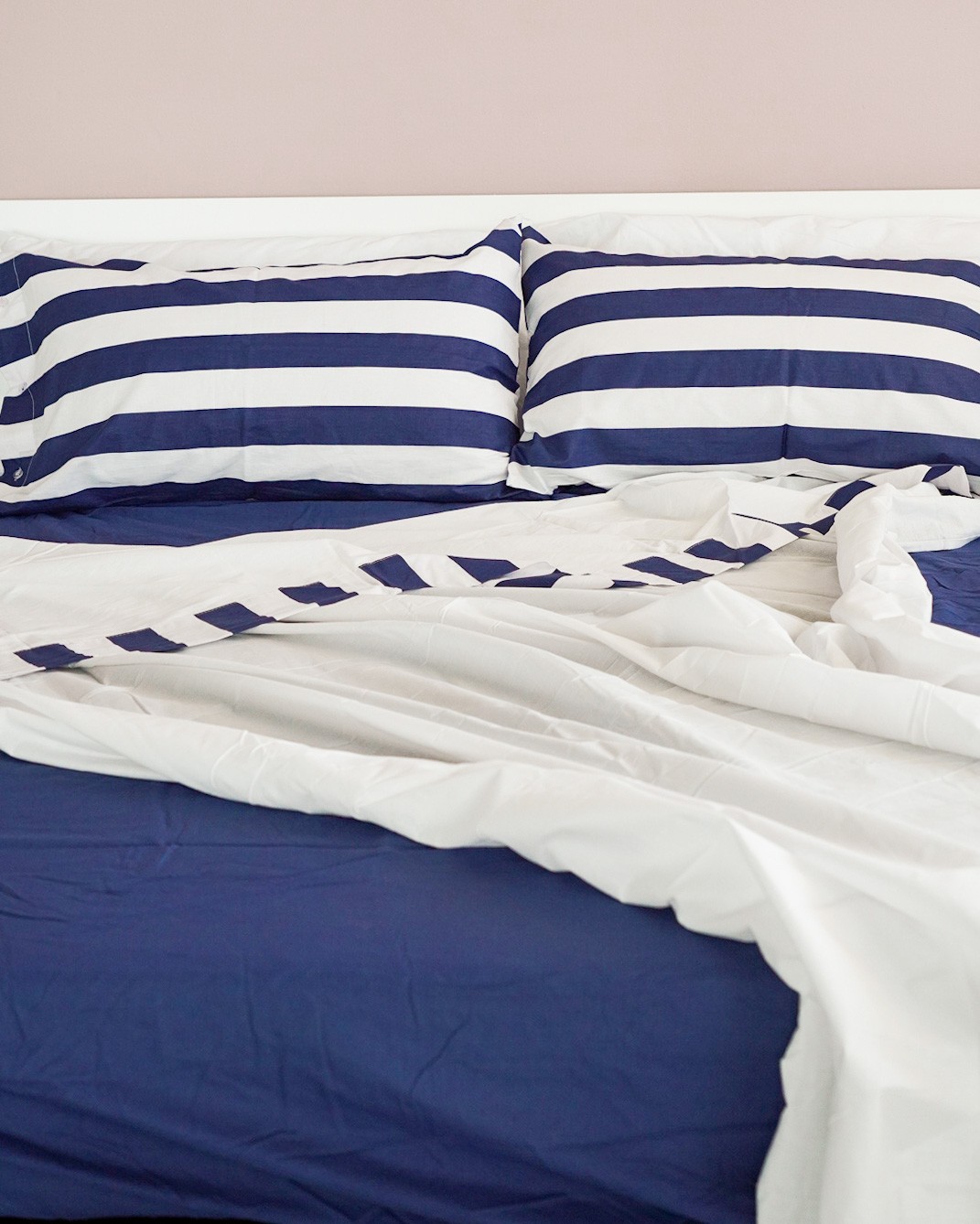 Il completo lenzuola Rivierè è per gli amanti delle righe, sotto con angoli in blu e lenzuolo piano in contrasto bianco con piegone che richiama le righe delle federe. Le federe si richiudono tramite bottoni.