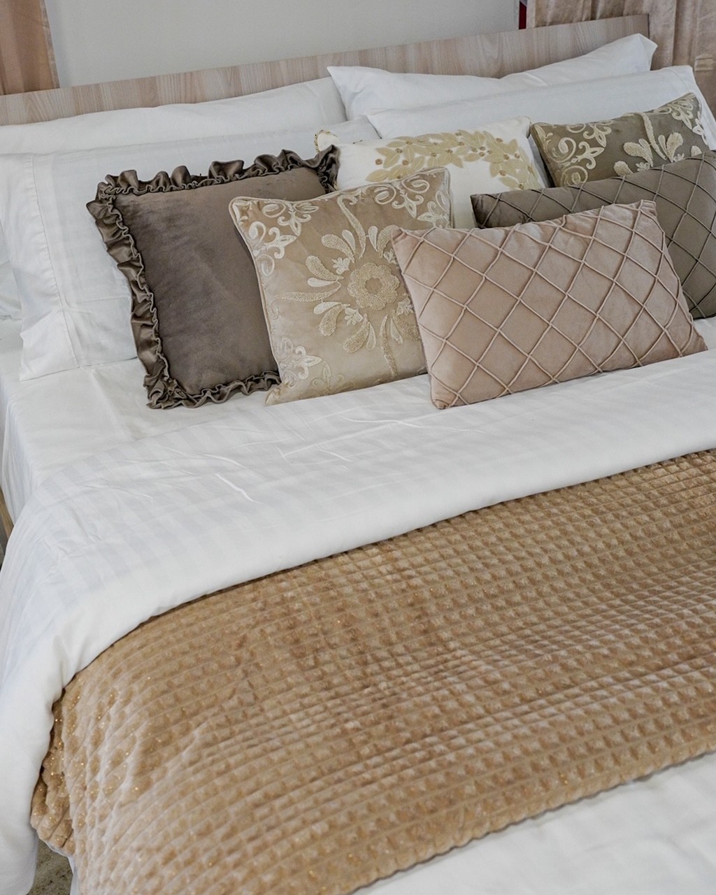 Questo completo letto matrimoniale è in raso. Il completo si compone di copripiumino e di 2 federe a sacchetto. Con lavorazione piping e con federe con bordo applicato.