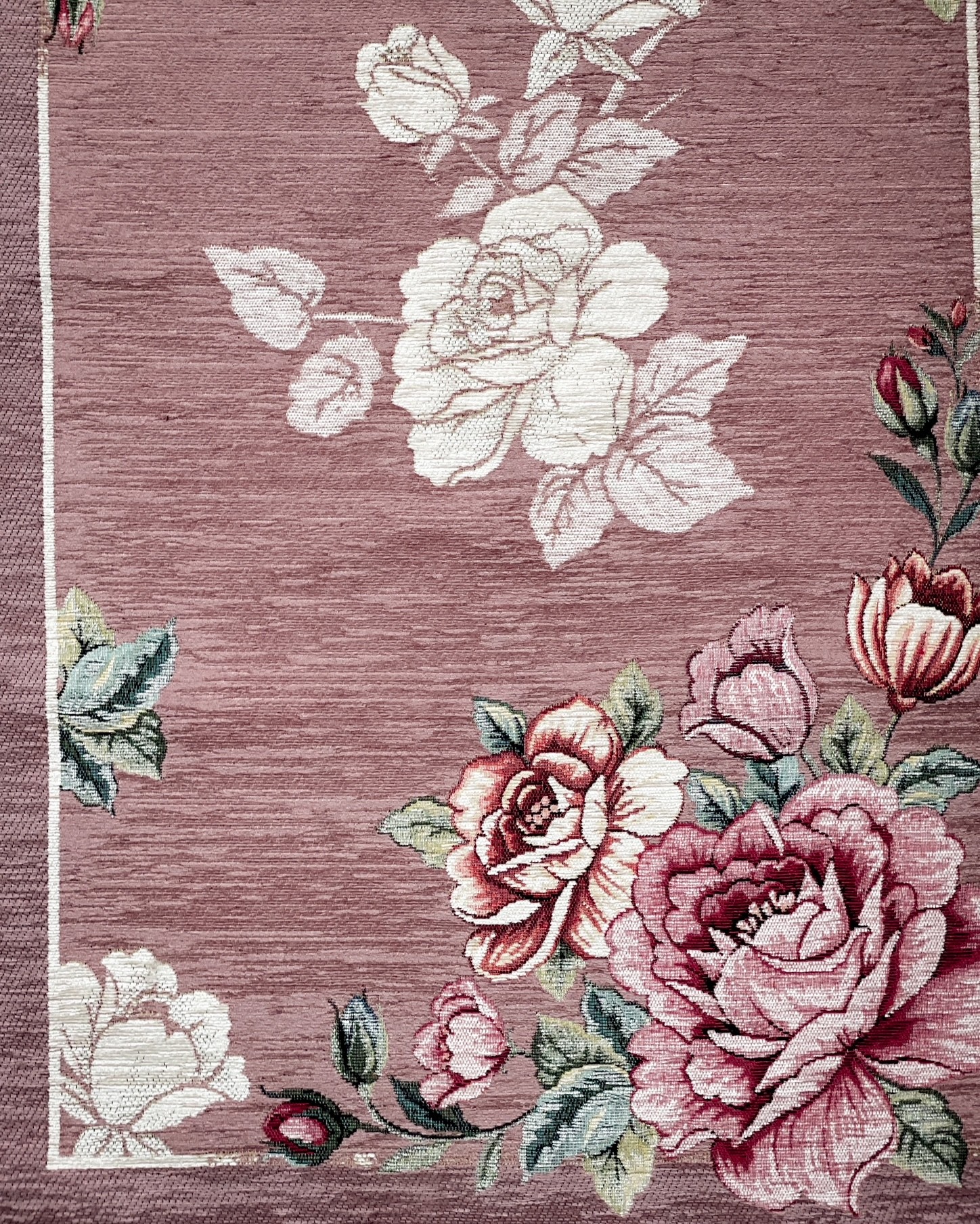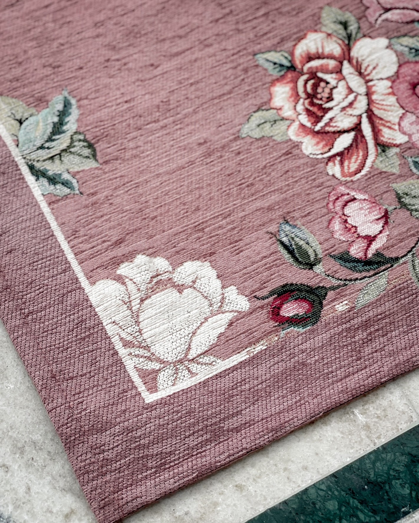 Il tappeto Alyssa è un tappeto cinigliato con disegno piazzato floreale, con le rose, ha un sottofondo in lattice che lo rende antiscivolo.