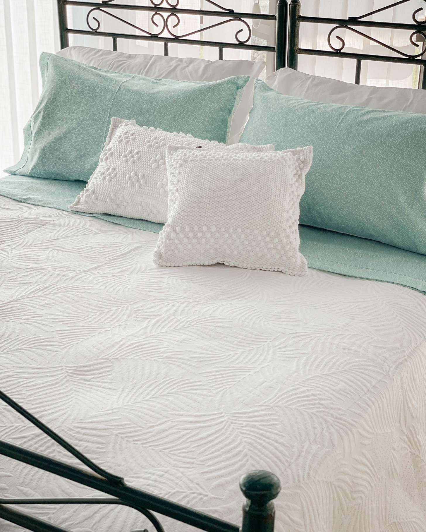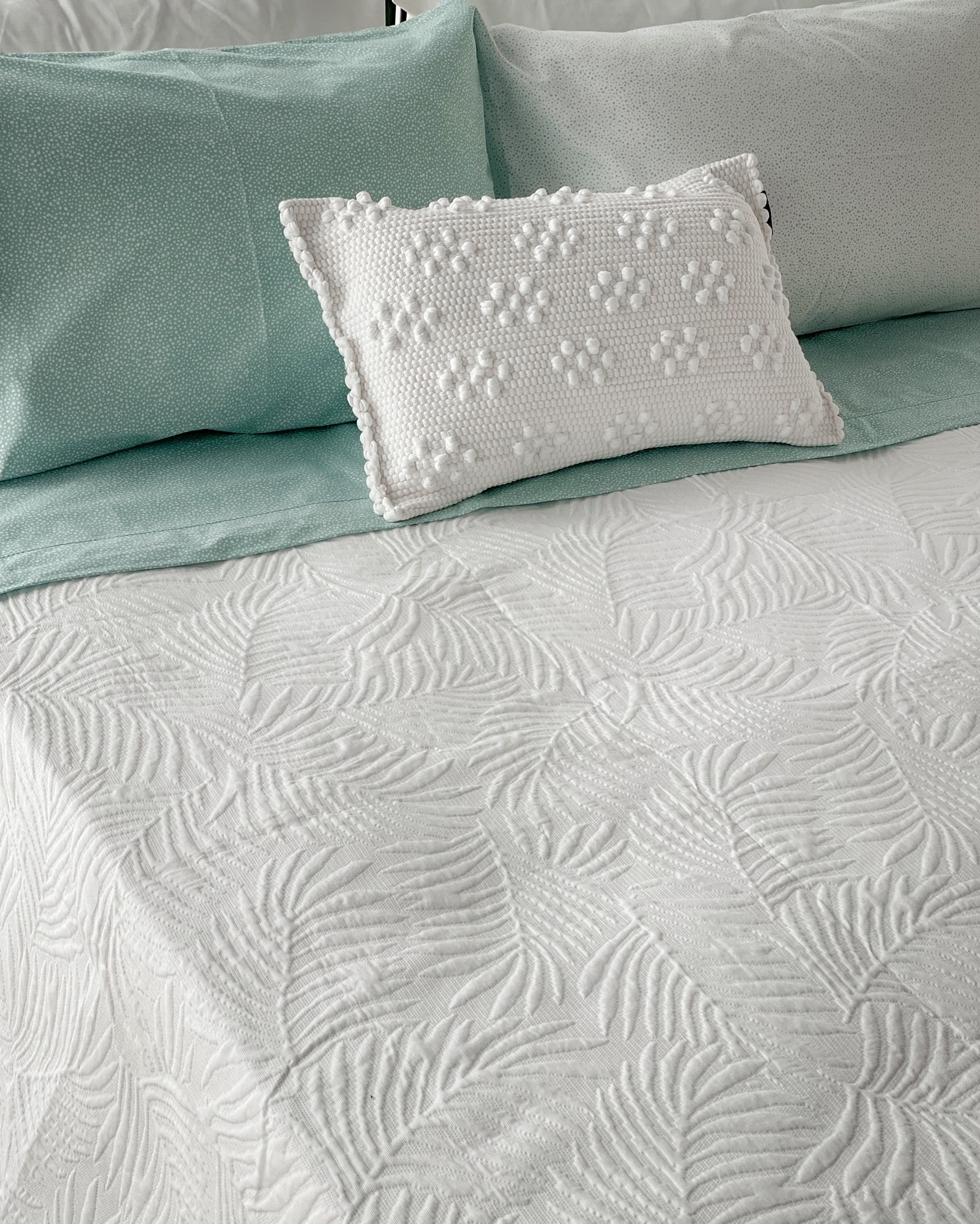 Linea Oro firma il copriletto Giamaica, in jaquard con un motivo foglie. Per uno stile che sposa il boho chic. Tessuto esterno misto cotone/poliestere.