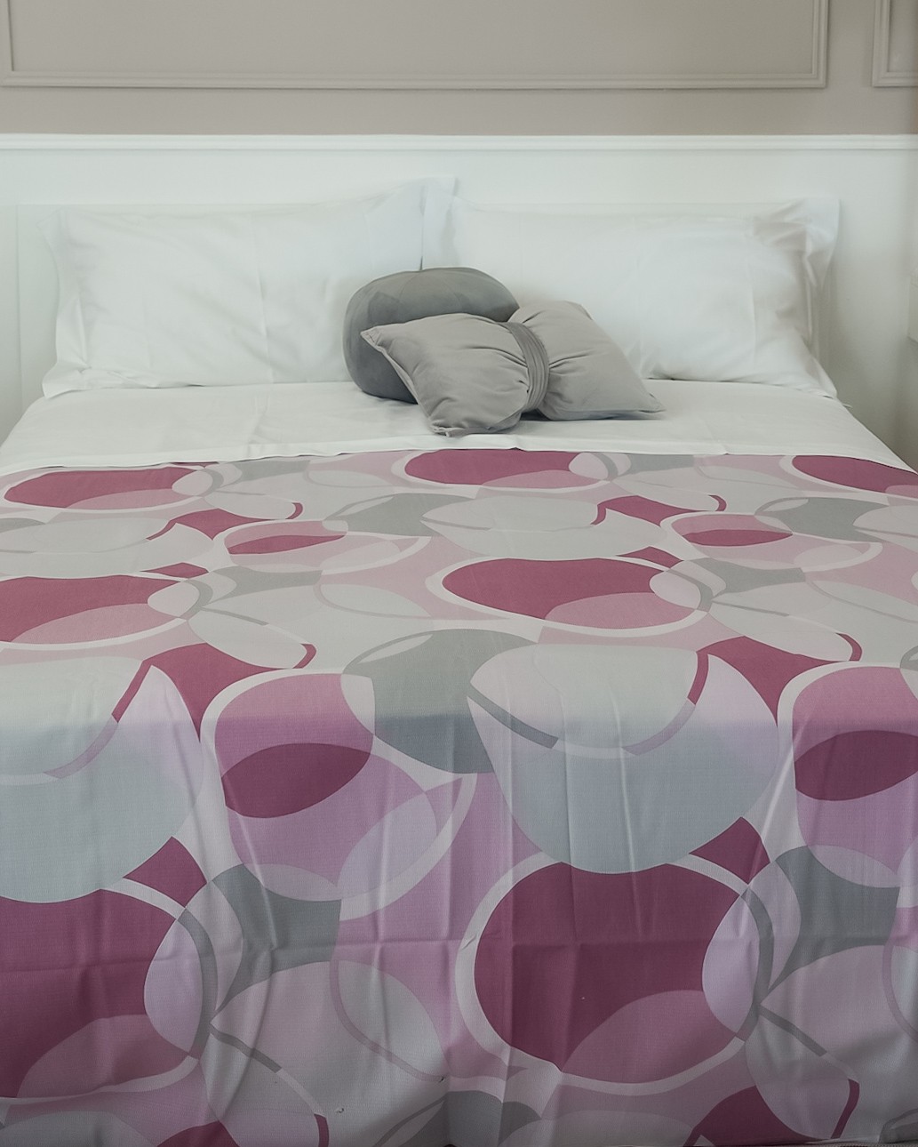 Un copriletto Nazareno Gabrielli con un particolare disegno geometrico a cerchi nei toni del rosa, del malva e vari tonalità di grigio. Perfetto per la stagione estiva, per chi non ama avere le lenzuola a vista e preferisce avere sempre una camera da letto ordinata.