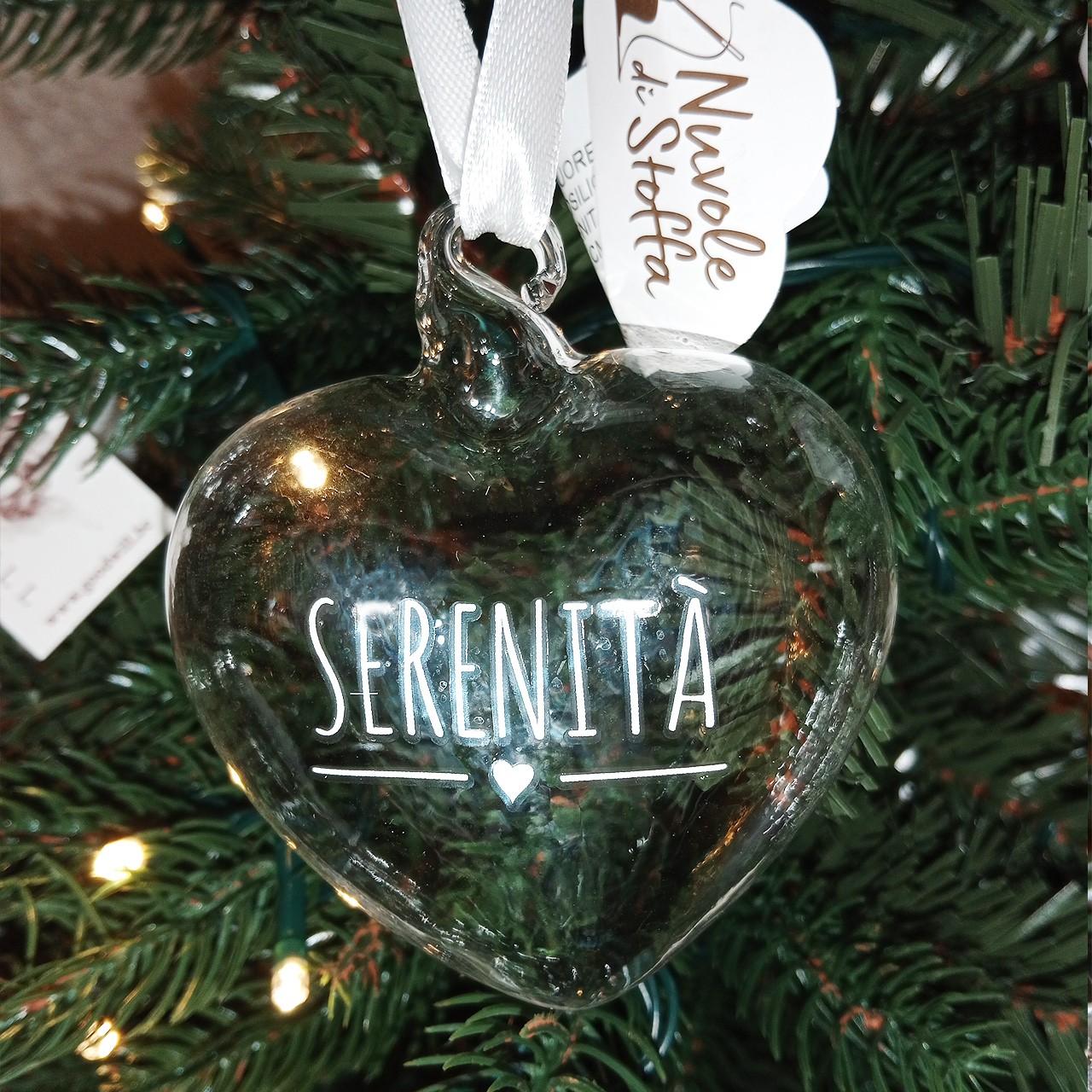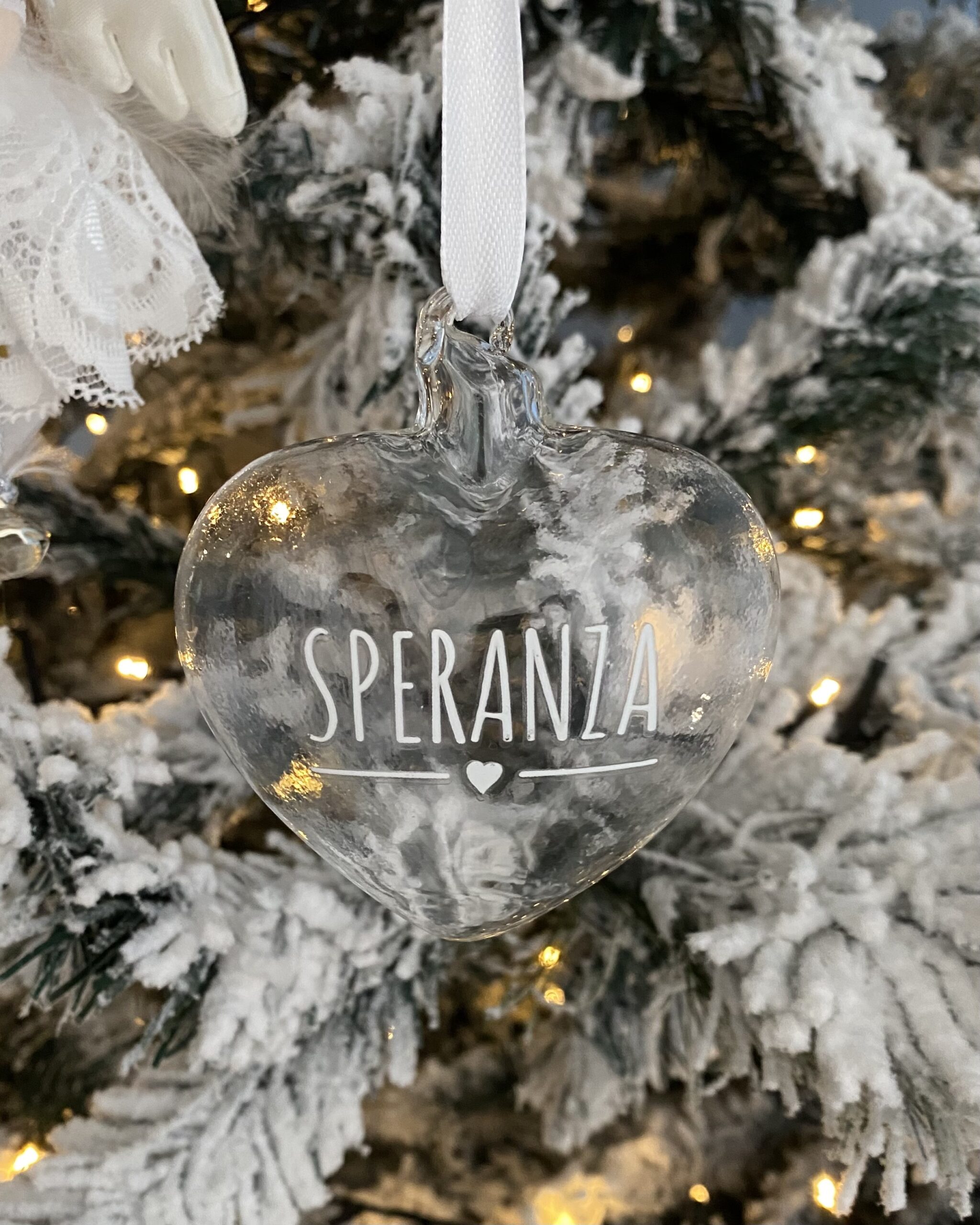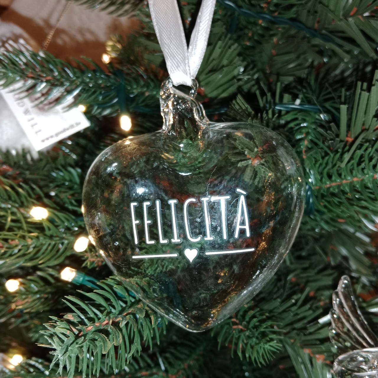Cuoricino in vetro borosilicato con scritta, scegli la tua preferita per addobbare il tuo albero o per regalare a chi vuoi bene un’emozione.