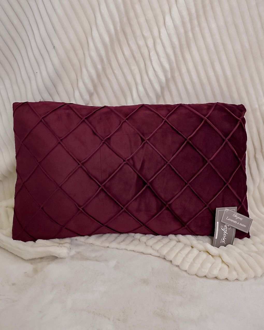 Questo cuscino in velluto è disponibile in varie colorazioni: Rosa, Tortora, Beige, Bordeaux e Grigio scuro. E’ un prodotto Preziosa, venduto con imbottitura come in foto. E’ lavorato a mano e presenta dei rombi sulla parte anteriore.