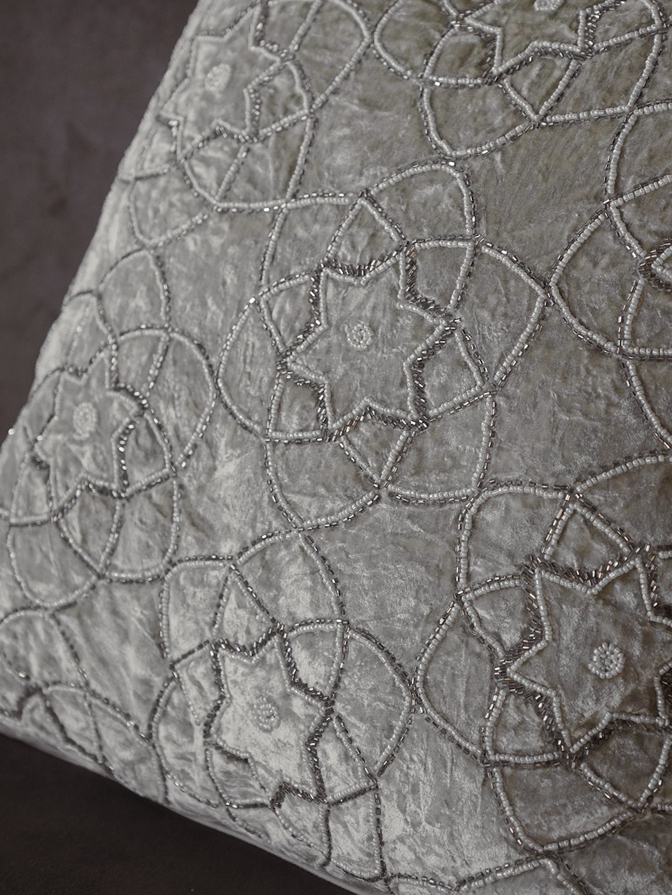 Cuscino arredo della linea Hanna Home, 45x45cm. Il cuscino è dotato di zip, è sfoderabile. Molto elegante, grazie alla parte anteriore con lavorazione con perline che creano un interessante disegno floreale che dona molta luce.