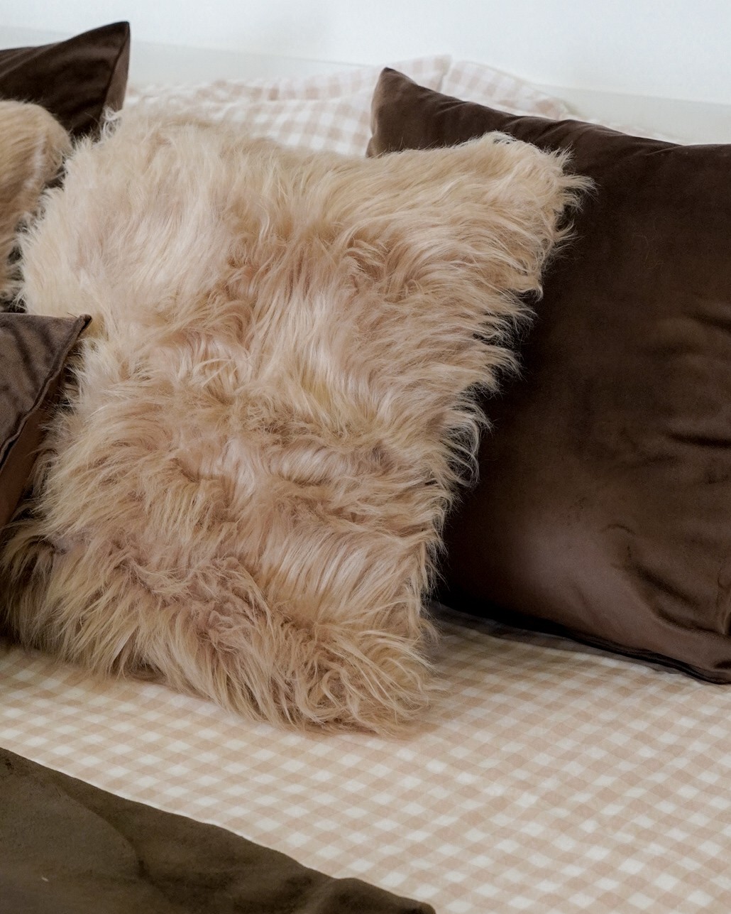 Cuscino arredo peloso e morbido. Imbottito come in foto. Sfoderabile. Parte anteriore con ecopelliccetta, parte posteriore in velate. Molto bello negli arredo delle stagioni più fredde. Abbinalo al suo tappeto per una combo perfetta.