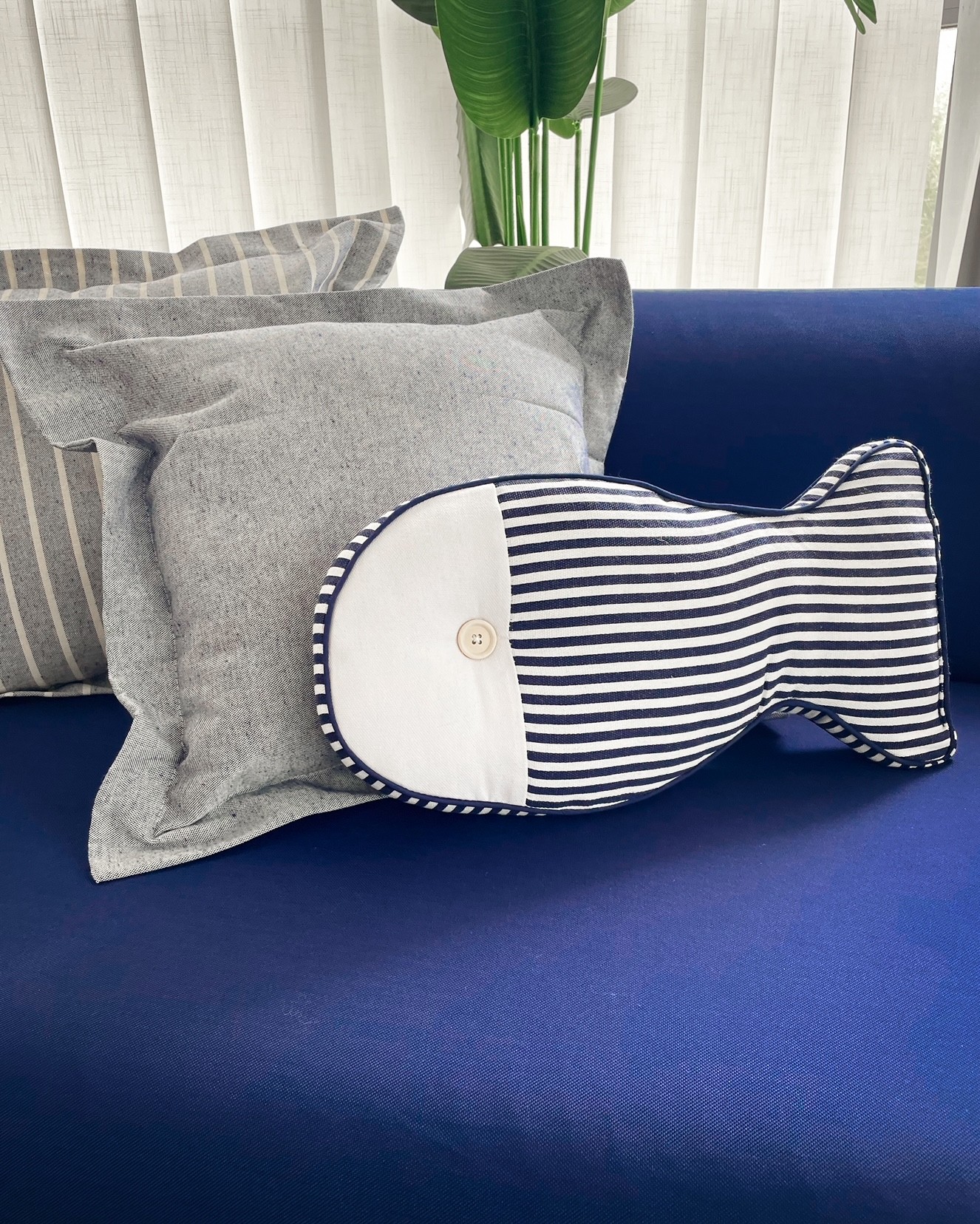 Cuscino Arredo Pesce a Righe Bianco e Blu Con Bottone