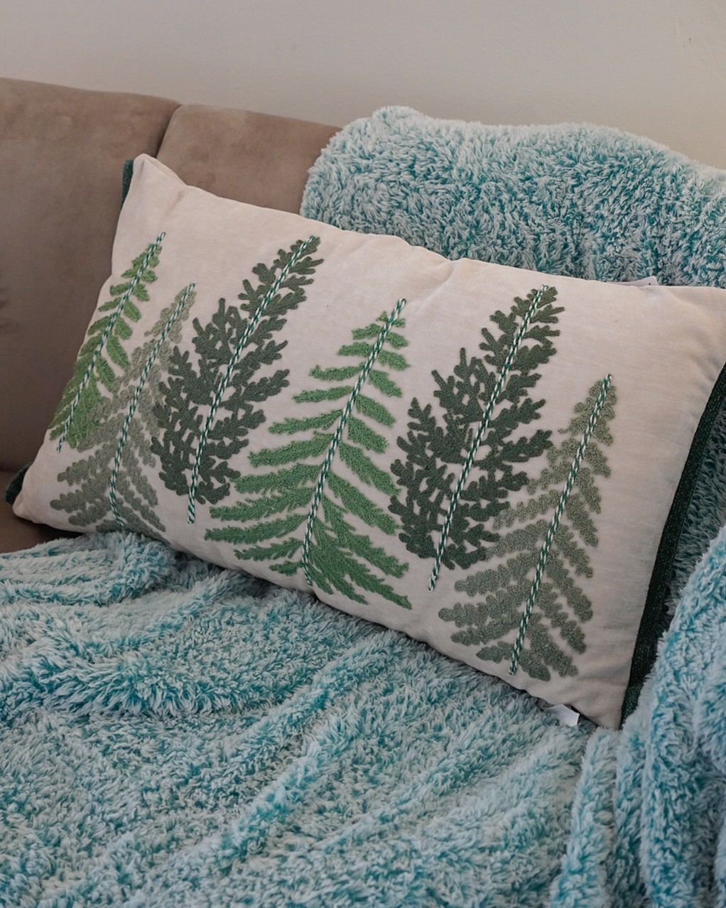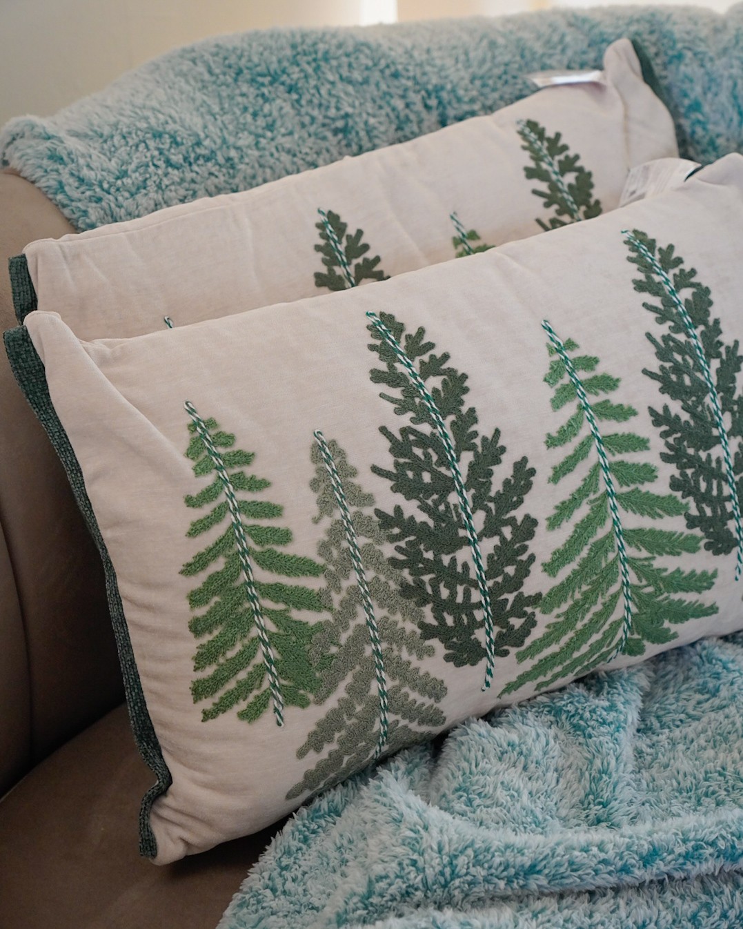 Cuscino arredo rettangolare alberi, in velvet, con zip e con applicazione punto spunga, in varie tonalità di verde che formano alberi su un elegante fondo crema.