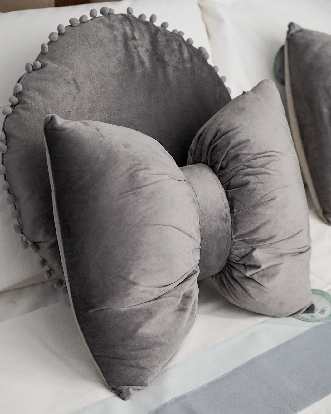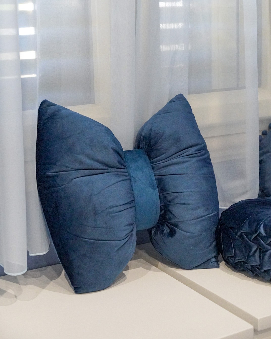 Cuscino a forma di fiocco in elegante velluto, sfoderabile, con zip.