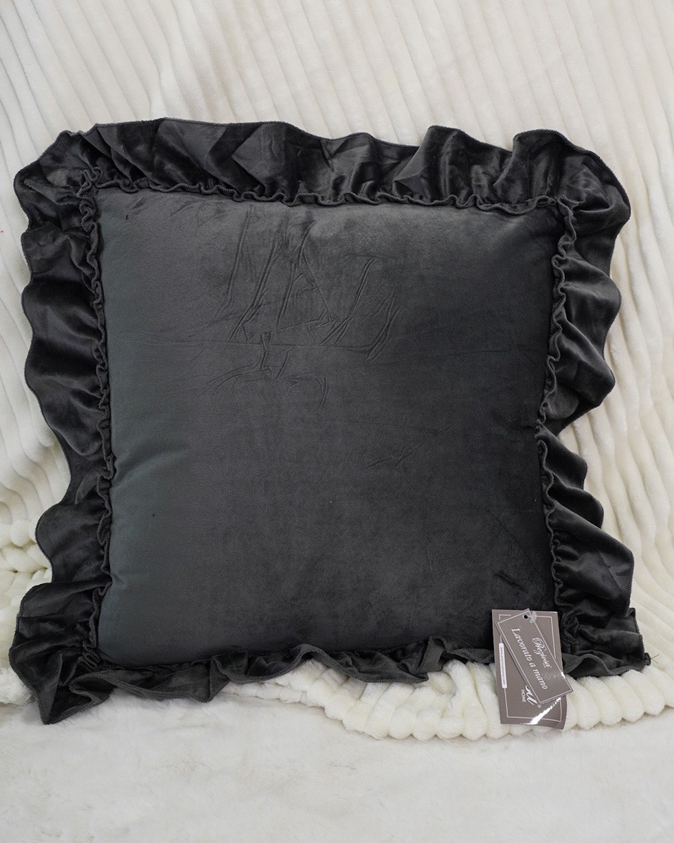 Questo cuscino in velluto è disponibile in varie colorazioni: Rosa, Tortora, Beige, Bordeaux e Grigio scuro. E’ un prodotto Preziosa, venduto con imbottitura come in foto. E’ lavorato a mano e presenta delle rouches su tutti i quattro lati.