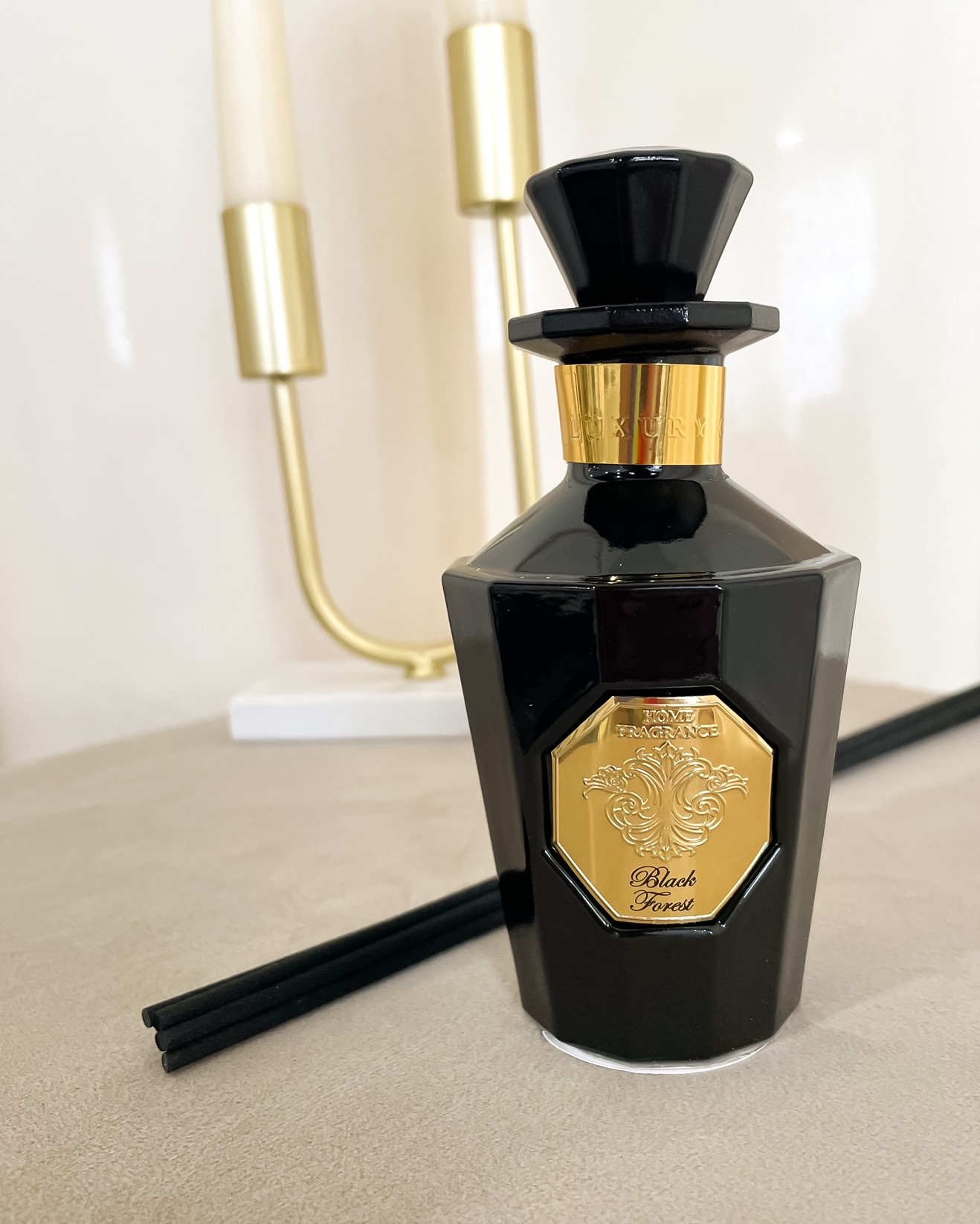 Un accessorio che porterà profumo alla tua casa e ai tuoi ambienti, con eleganza e tanto carattere. Diffusore di fragranza Black Forest, contenitore in vetro, design geometrico, tappo in vetro e applicazioni dorate. Nella confezione 5/6 midollini. Il diffusore fa parte della Luxury Collection.