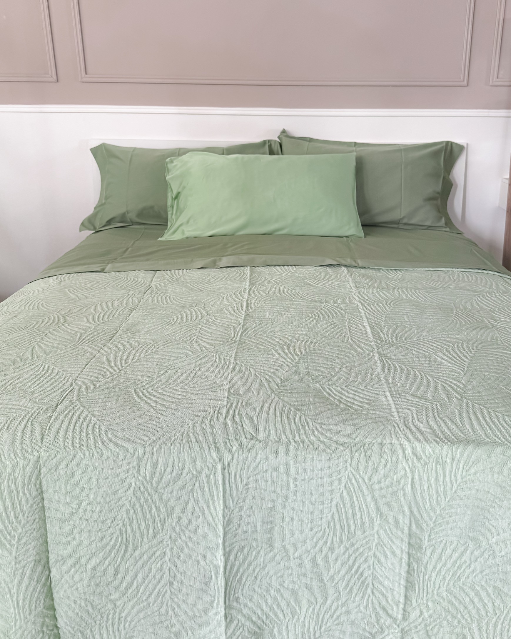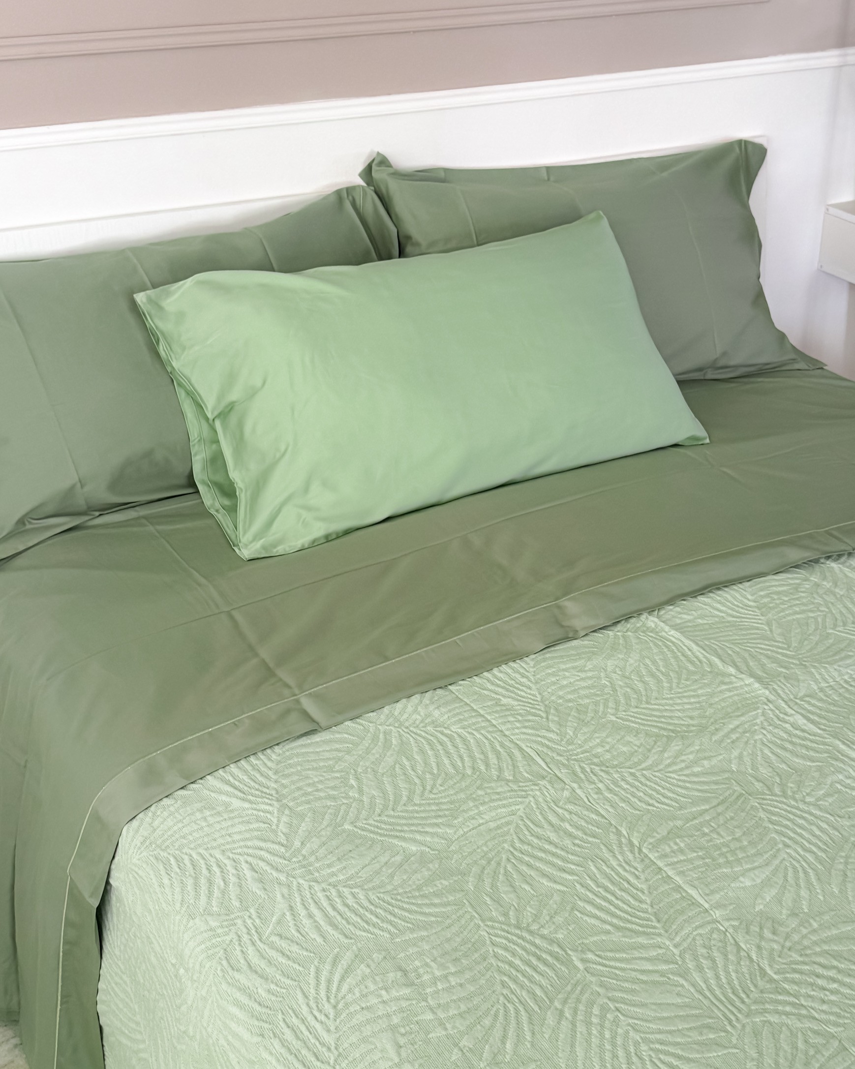 Completo letto matrimoniale in raso di puro cotone rifinito con punto raso zig zag in tinta.