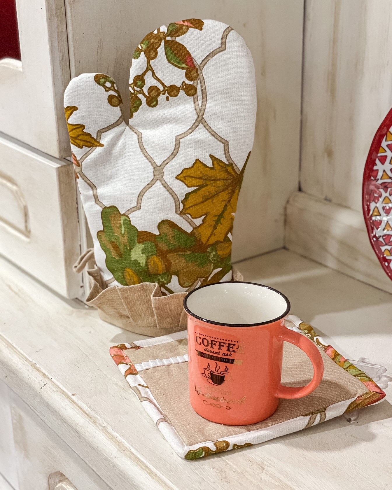 Dai Tipici colori Autunnali, questo meraviglioso set guanto e presina appartenente alla linea Foglia by Preziosa, arricchirà la vostra cucina regalando calore e un tocco in più di stile.