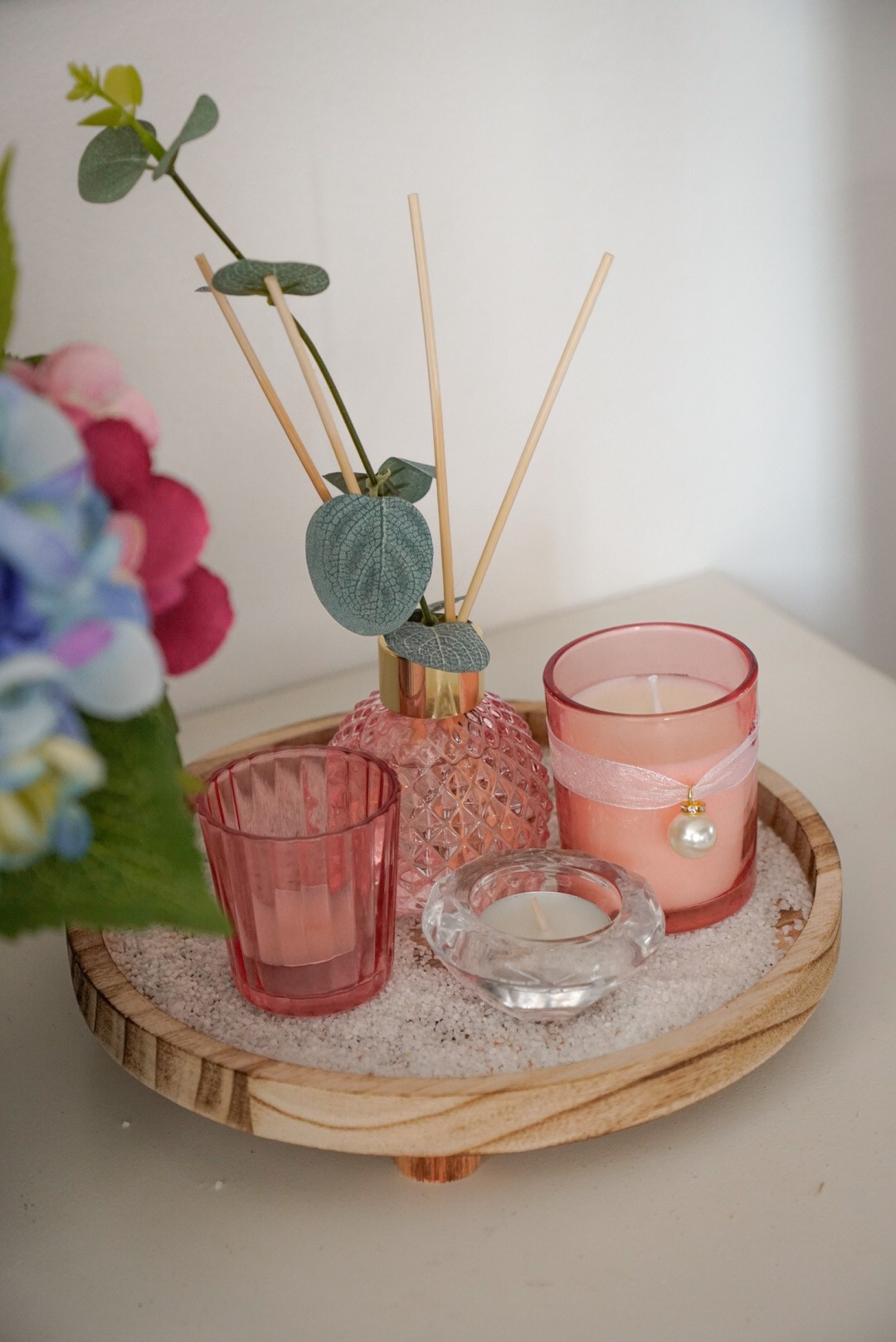 – Kit nei toni del rosa con un bicchiere rosa con nastrino e perlina con all’interno una candela da 90 gr con fragranza Peonia, un bicchierino in vetro con un moccoletto + 4 bastoncini e 1 rametto di eucalipto artificiale da inserire in una boccetta con fragranza Peonia da 100ml;
