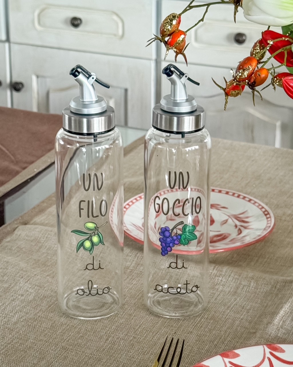 Set olio e aceto in vetro, con scritte e disegno in rilievo.