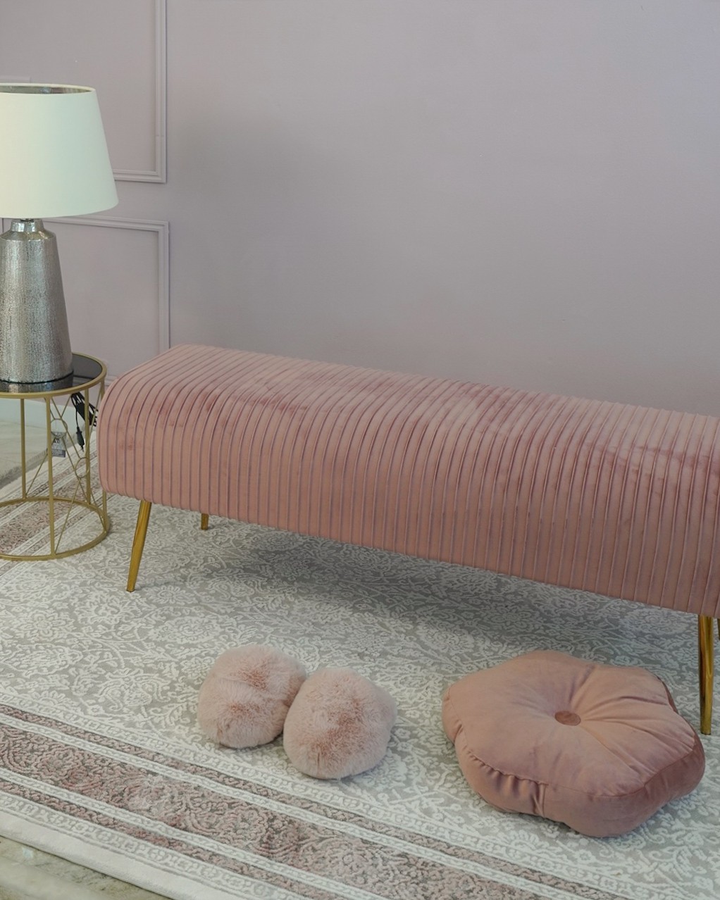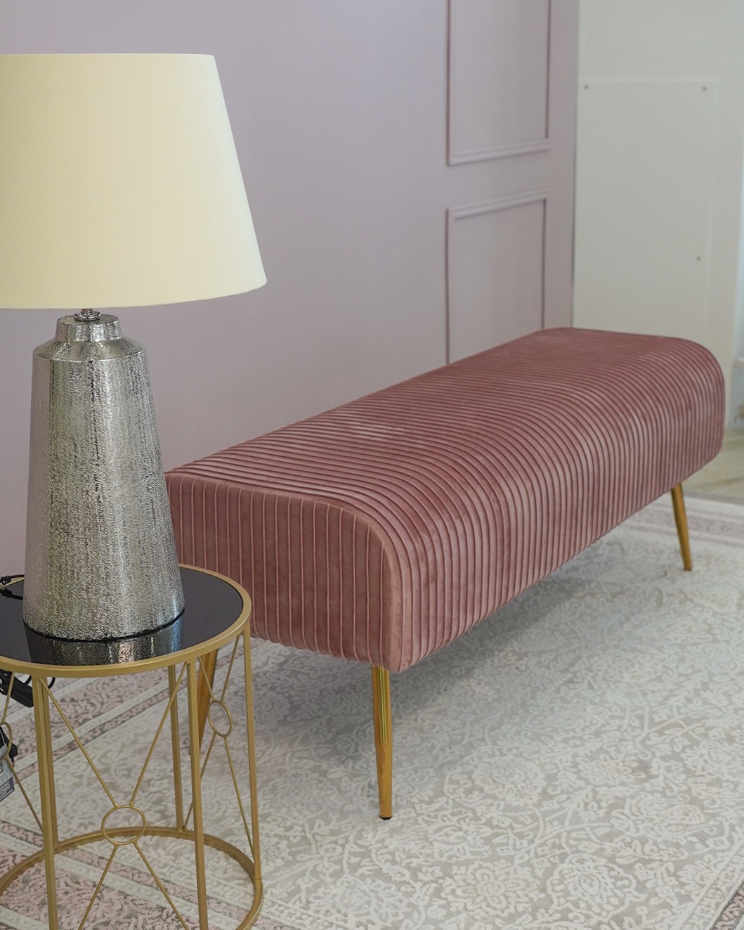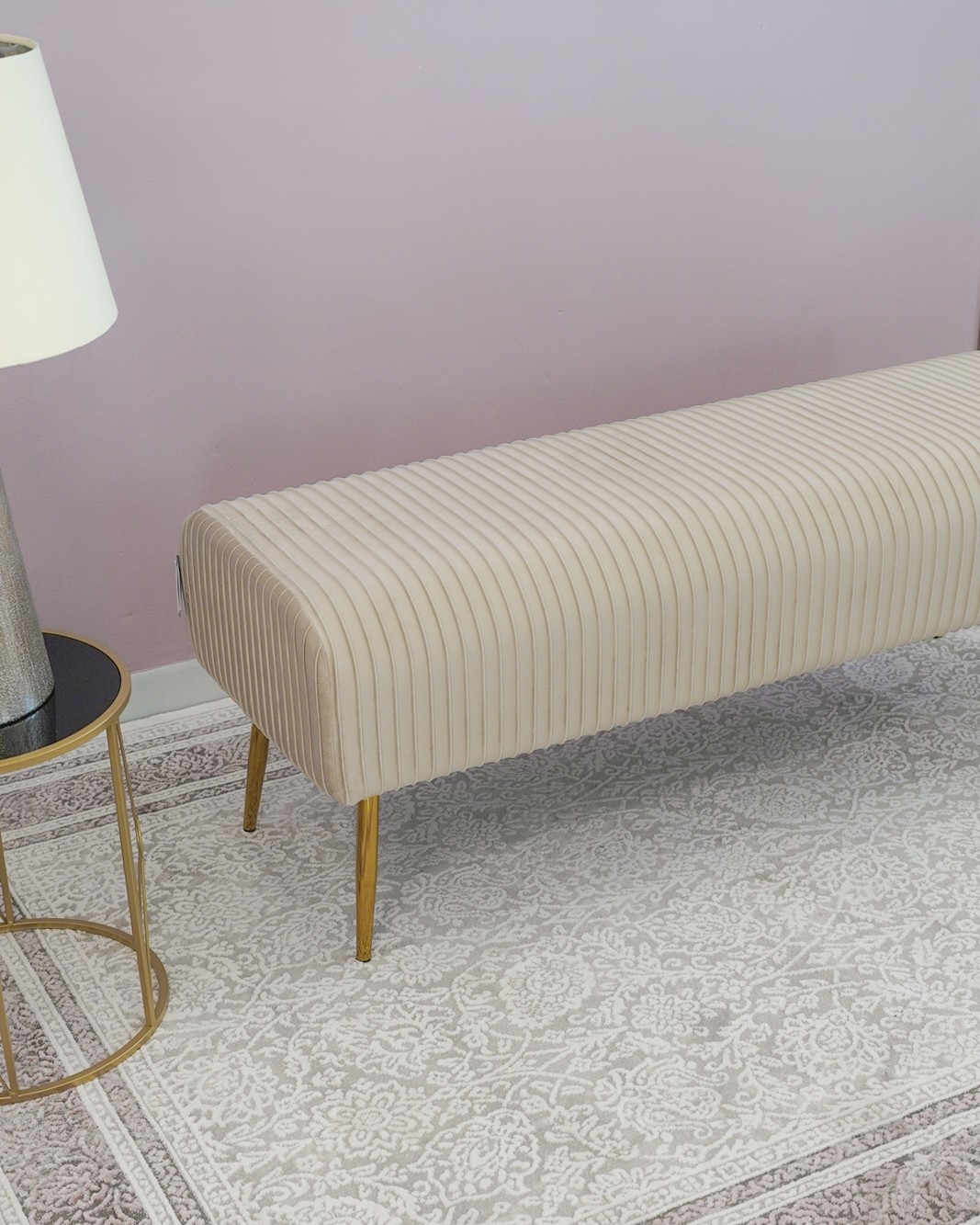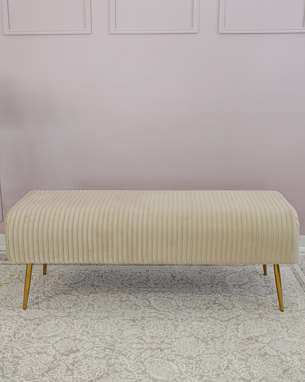 Panca Gigante A Righe In Velluto con Piedi a spillo in metallo dorato Hanna Home. Utilizzabile all’ingresso, ai piedi del etto, come divisorio tra un ambiente e l’altro, la panca gigante donerà eleganza alla vostra casa. Molto resistente.