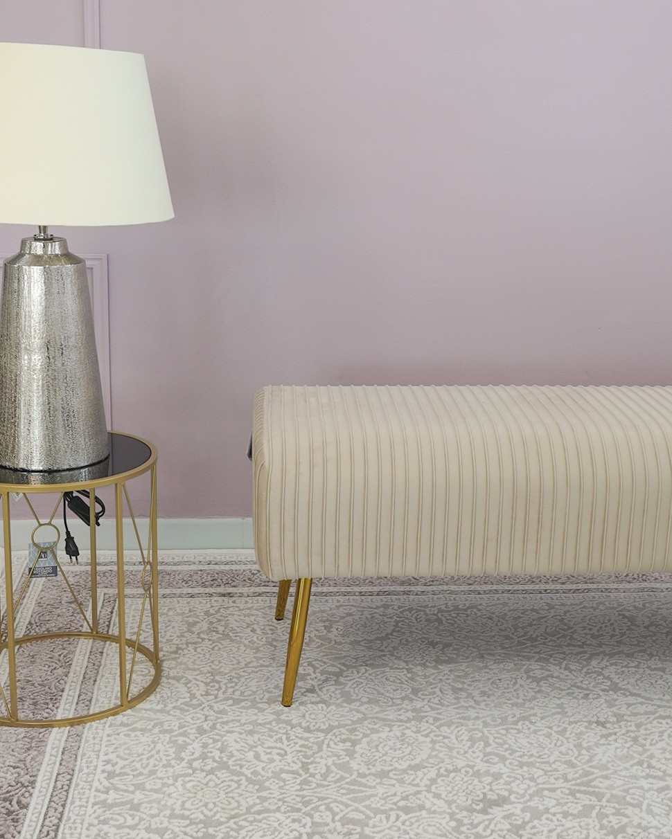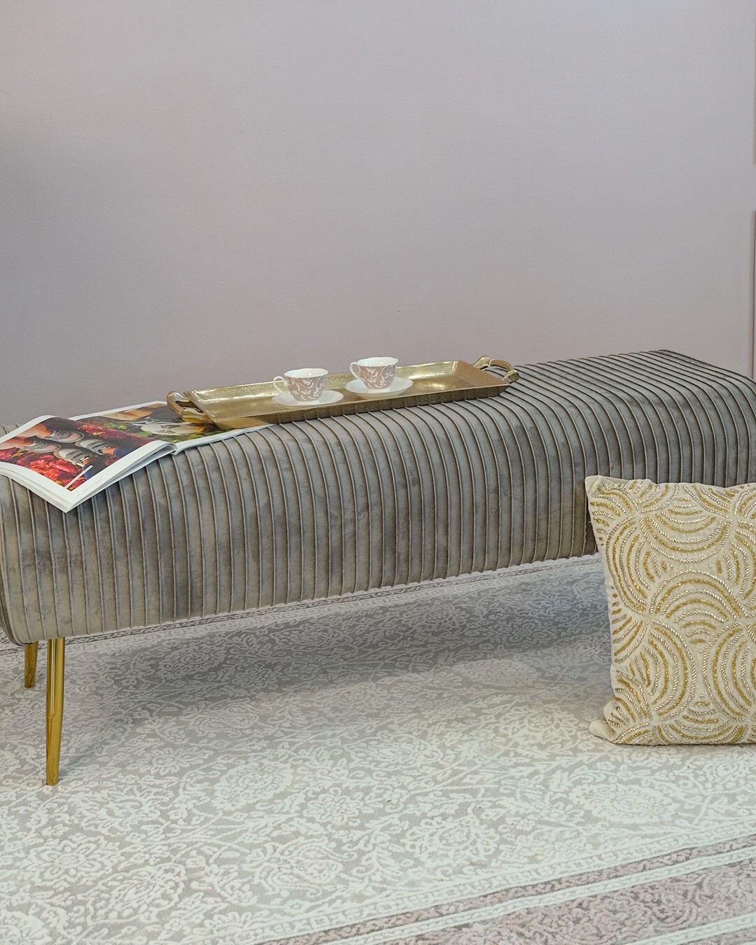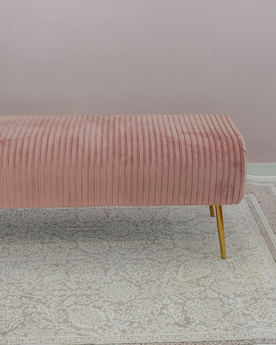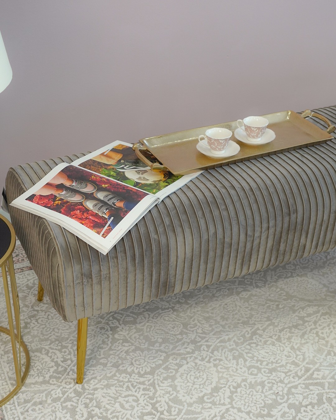 Panca Gigante A Righe In Velluto con Piedi a spillo in metallo dorato Hanna Home. Utilizzabile all’ingresso, ai piedi del etto, come divisorio tra un ambiente e l’altro, la panca gigante donerà eleganza alla vostra casa. Molto resistente.