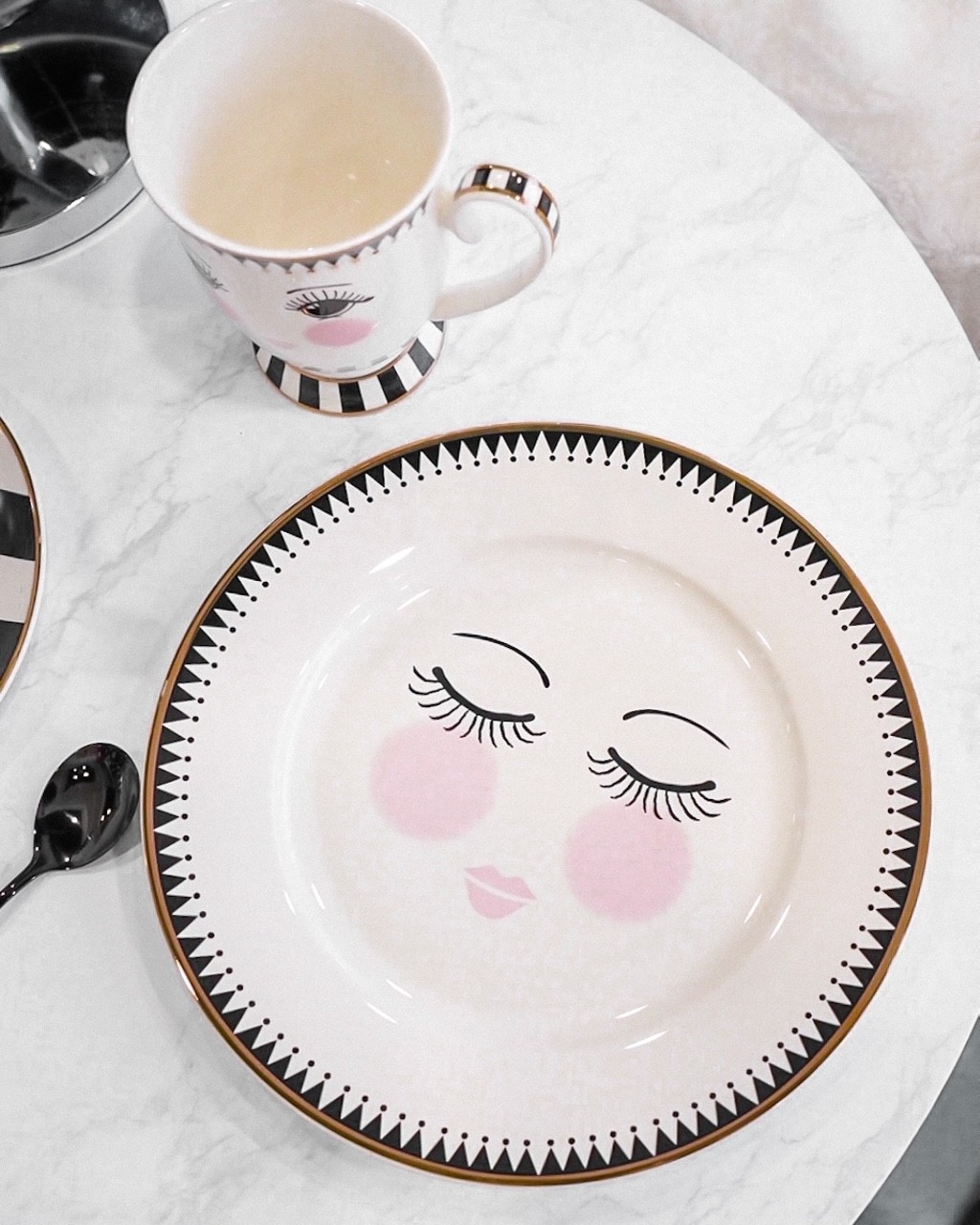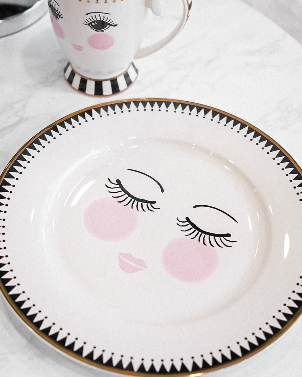 Di estrema delicatezza è questo piattino di Miss Etoile. Sul piattino sono stati rappresentati degli occhi chiusi, delle guance rosa e delle labbra rosa, l’interno contorno presenta una fantasia a triangoli e pois.