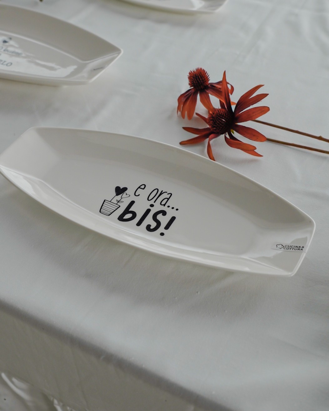 Piatto vassoio ovale in ceramica, disponibile in 3 dimensioni, ognuno caratterizzato da una frase fresca, moderna e divertente. Belli da avere per stupire gli occhi e altrettanto belli come idea regalo.