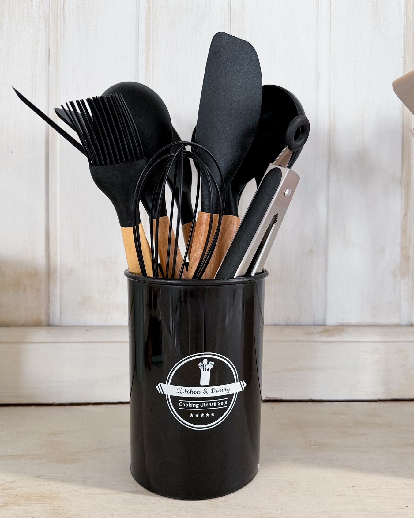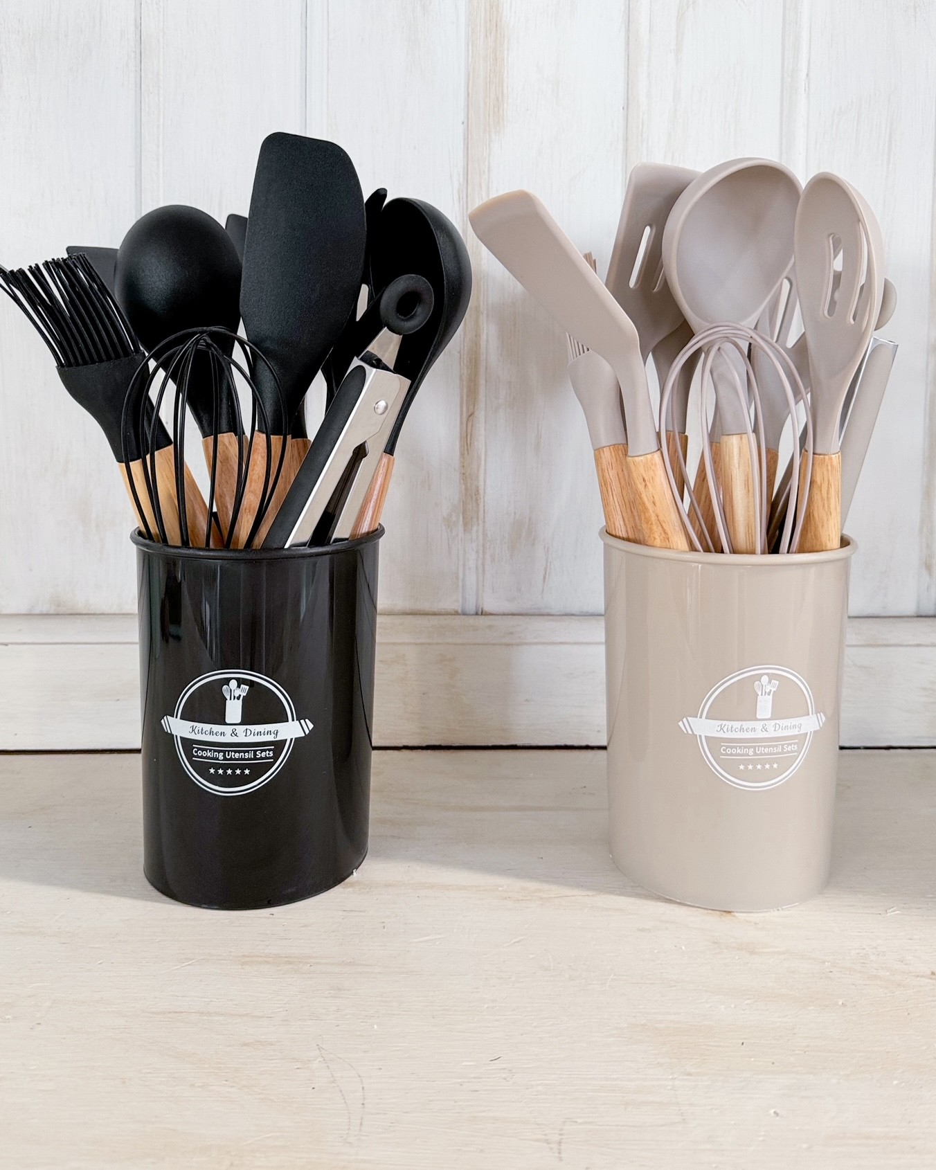 Set Porta utensili da cucina con 12 utensili. Comodo e pratico, porta utensili in plastica e utensili in silicone con manico in legno, tra gli utensili vari tipi di mestoli, spatole, pennello per dolci, pinza e frusta, la pinza è anche in metallo.