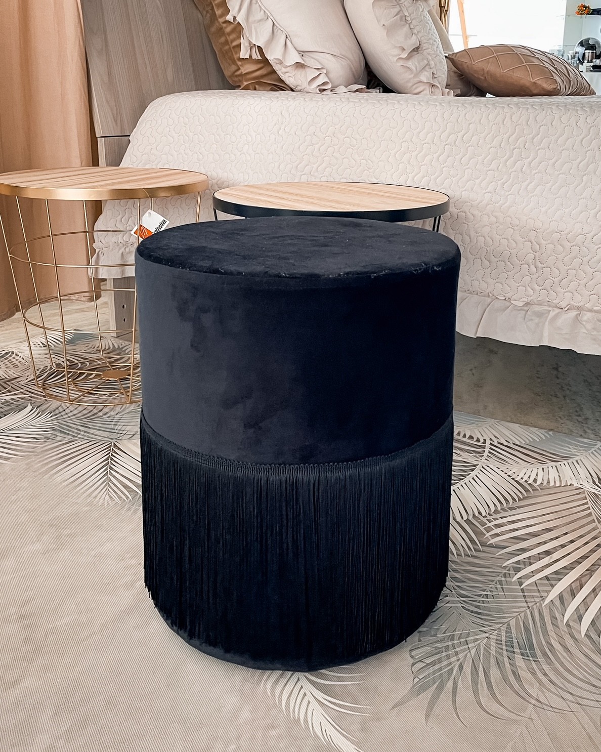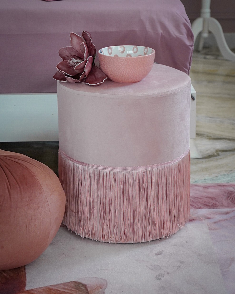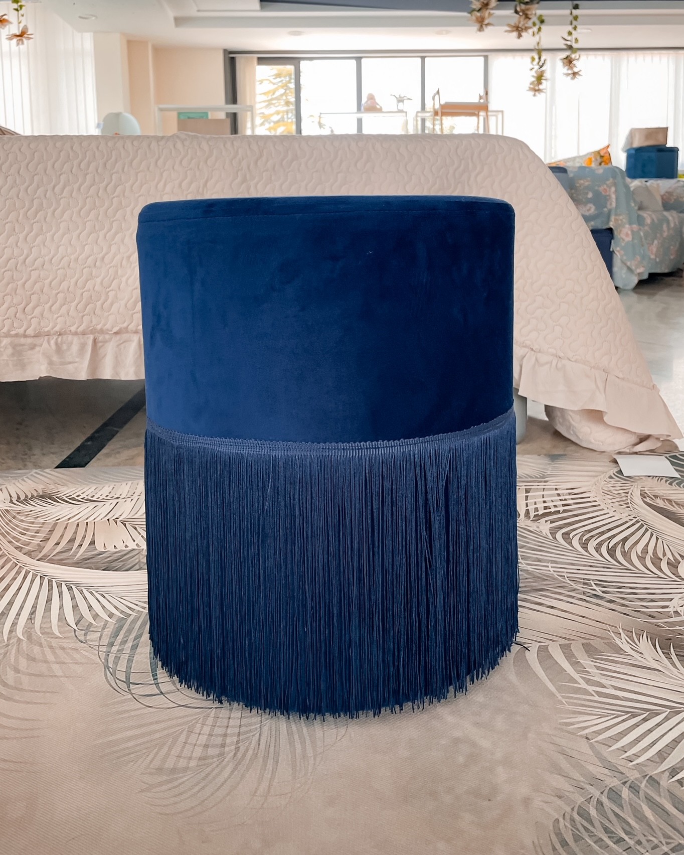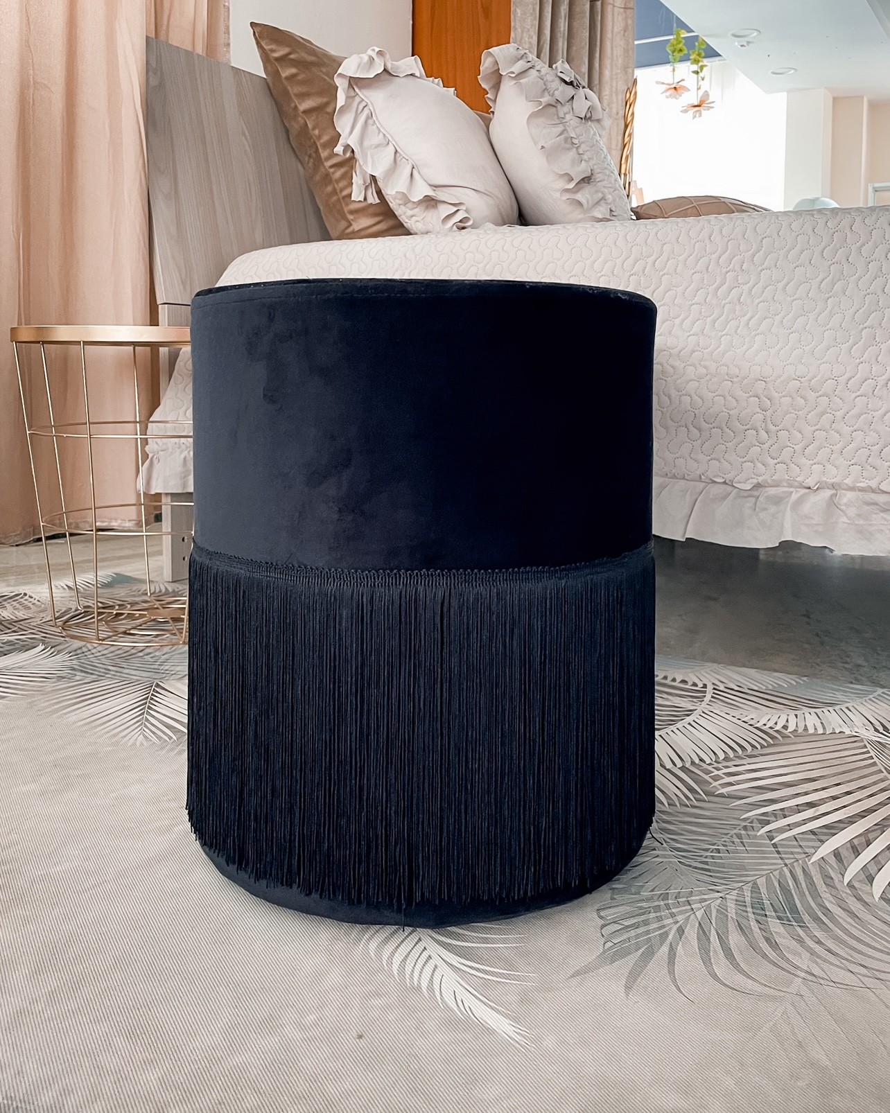 Il Pouf Malibù è un pouf molto elegante, in velluto con frange. Solitamente viene utilizzato nelle cabine armadio o come seduta per una toilette, ma può essere utilizzato anche in zona living o camera da letto.