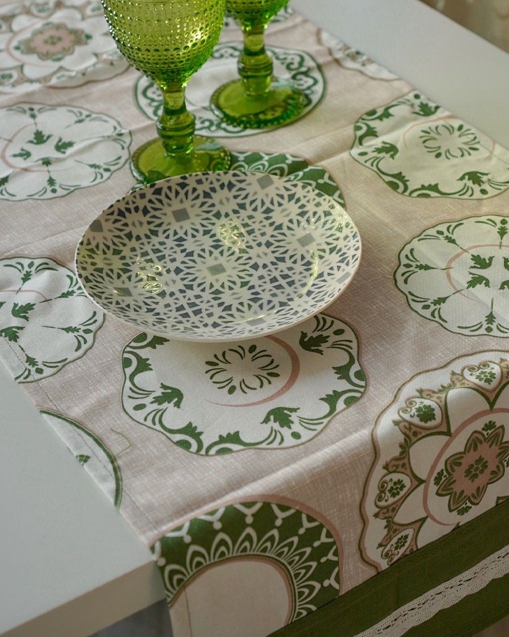 Runner Ambra Verde in Cotone con Bordo Merletto