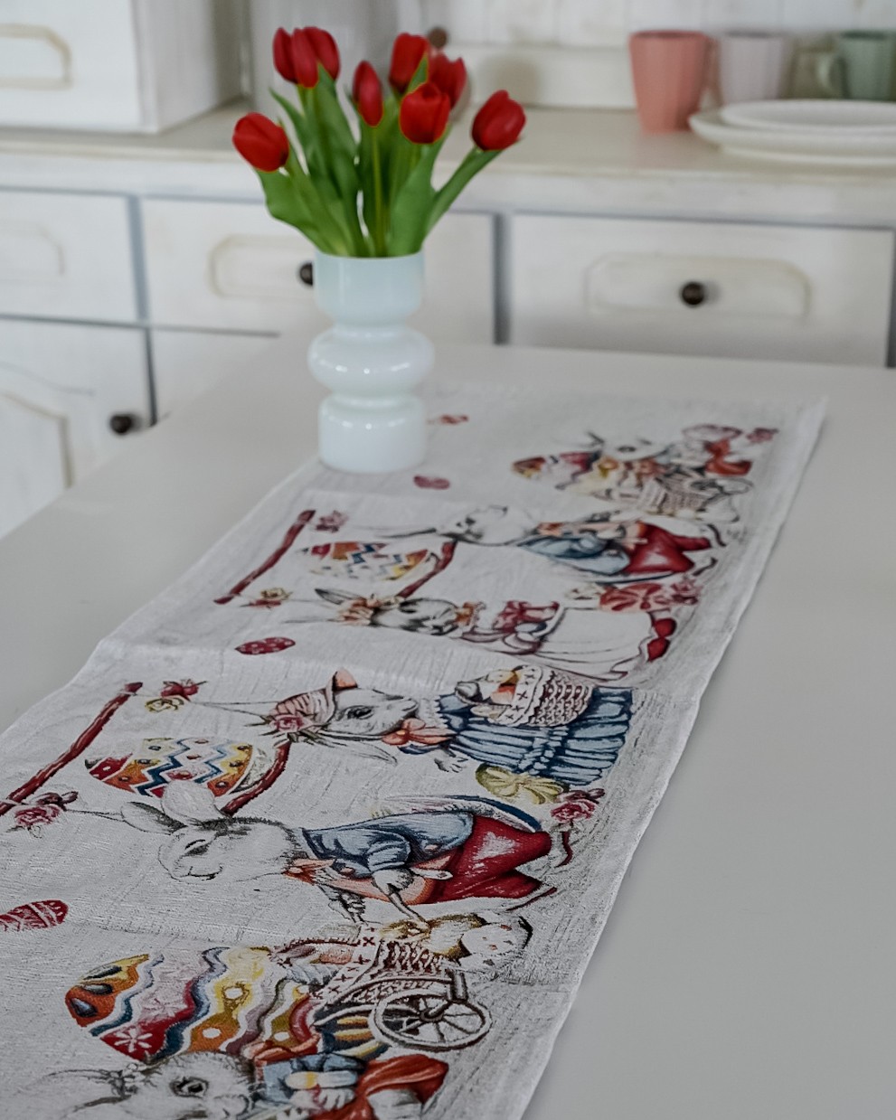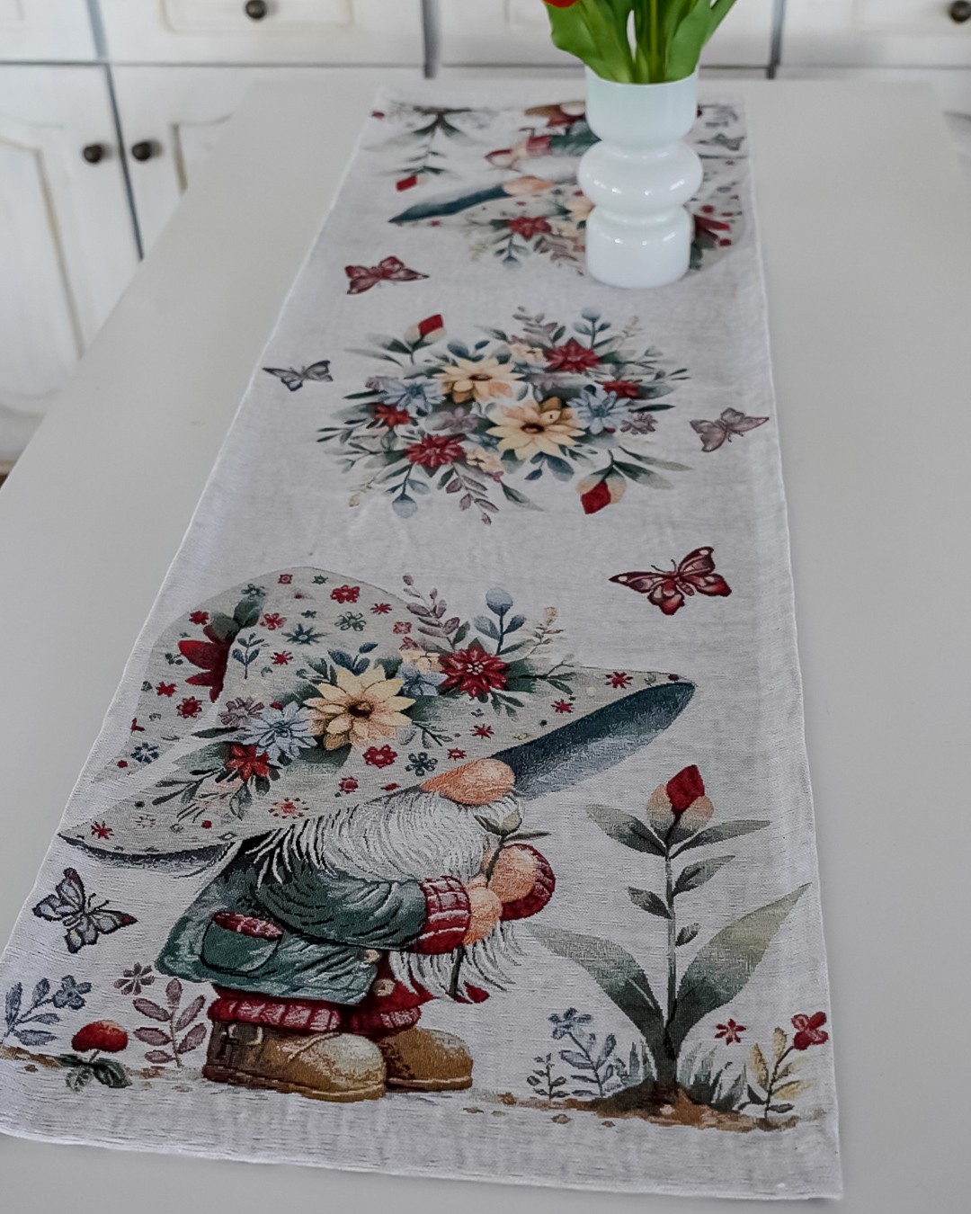 Runner in Gobelin, Tessuto jacquard cinigliato. Una linea pensata per le festività pasquali, disponibile in due modelli in due dimensioni: uno caratterizzato da coniglietti, l’altro da simpatici gnomi con fiori. Della stessa linea puoi trovare il runner e i cuscini arredo, sia quadrato che rettangolare.