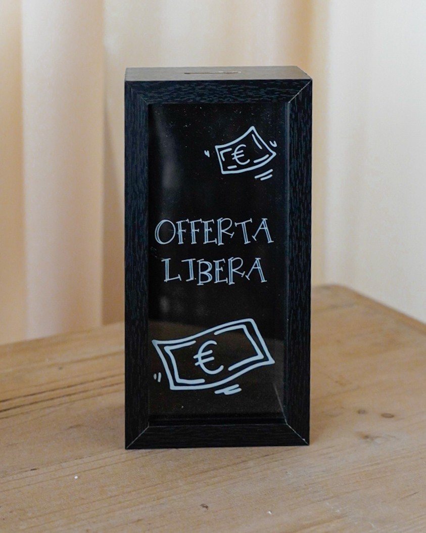 Sempre comodo avere un salvadanaio in casa. Questo è di dimensioni ridotte, molto carino da avere in un angolo della casa, da appendere o da appoggio. Versione Nera con scritta “Offerta libera” o versione con bordo grigio chiaro e scritta su vetro “Piccoli Sfizi”.