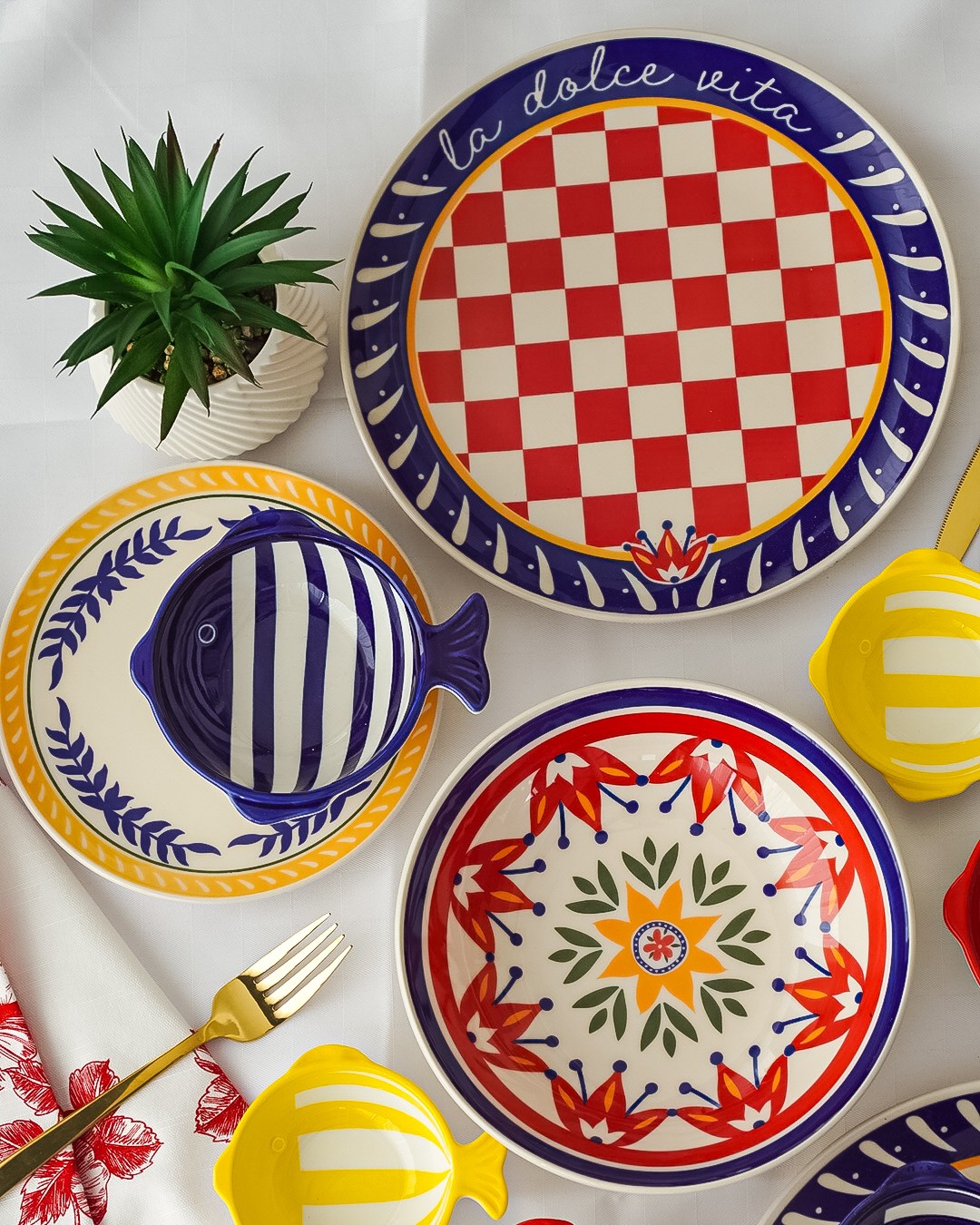 Piatti moderni, eleganti e resistenti. Ideali per la tavola di tutti i giorni oppure per le cene in compagnia. Creeranno un’atmosfera elegante grazie al loro design molto particolare. Pratici e resistenti. Questi piatti si distiguono per la loro originalità artigianale, per questo la diversità, uno dall’altro, li rende unici ed inimitabili. Blu, rosso e giallo i colori dominanti, piatto fondo, piano e frutta completamente diversi gli uni dagli altri.