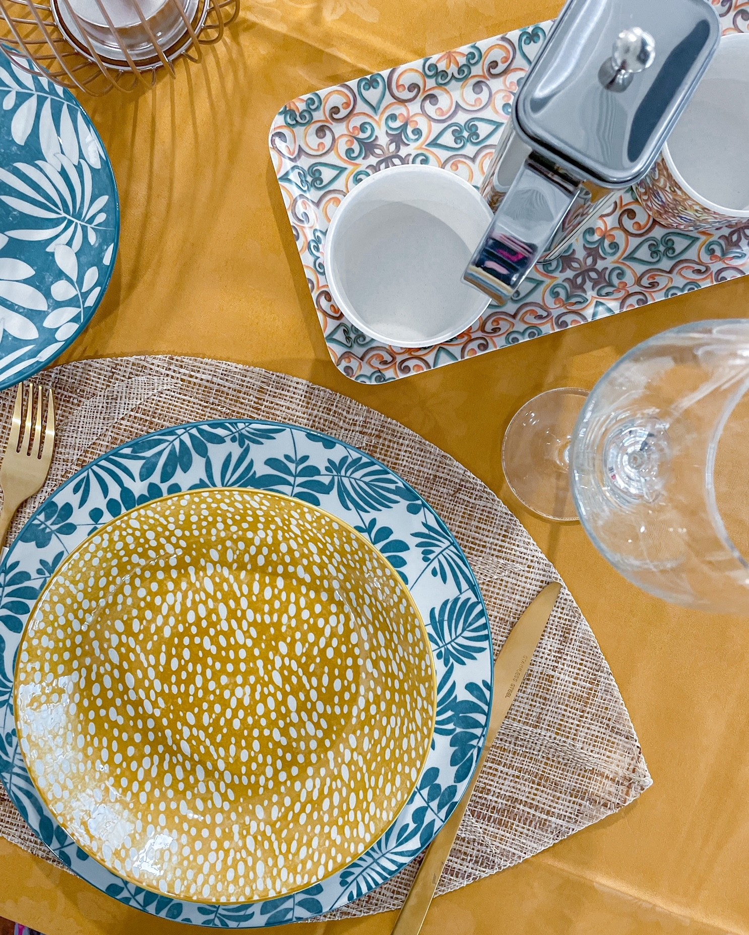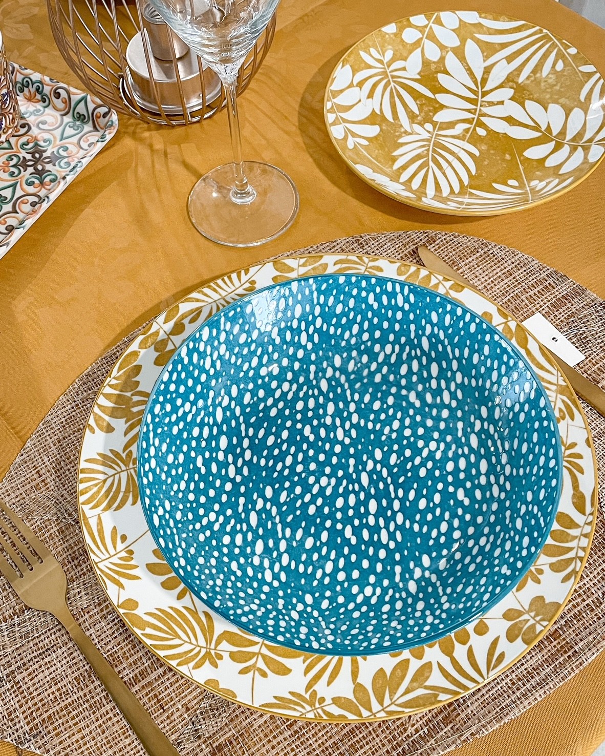 Il servizio di piatti 12 pezzi Merida, ispirato allo stile jungle grazie al caratteristico decoro a foglia tropicale, è perfetto per portare in tavola stile e personalità, ricreando un’atmosfera calda ed estiva con i suoi colori ocra e petrolio. Composto da 4 piatti piani, 4 piatti fondi e 4 piatti dessert in porcellana, questo servizio piatti è lavabile in lavastoviglie ed idoneo all’utilizzo in microonde.