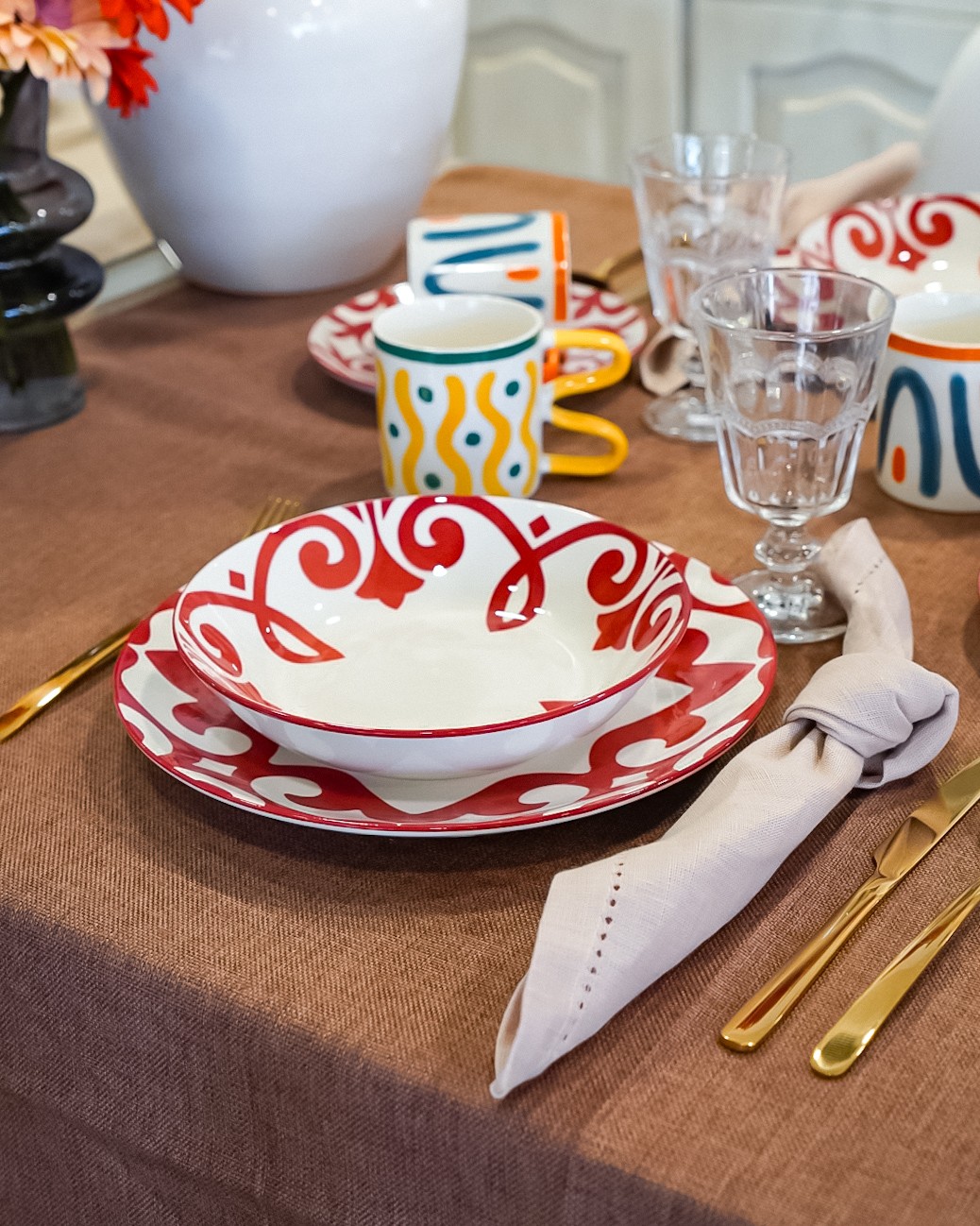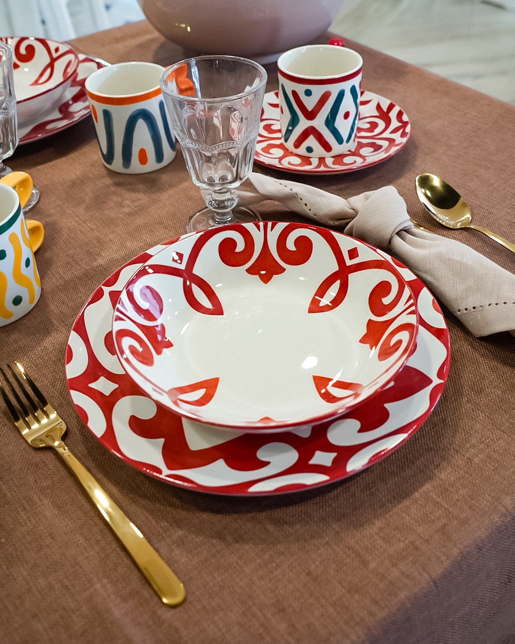 Servizio piatti 18 pezzi per 6 persone, bianco e rosso con un motivo geometrico molto particolare. In porcellana