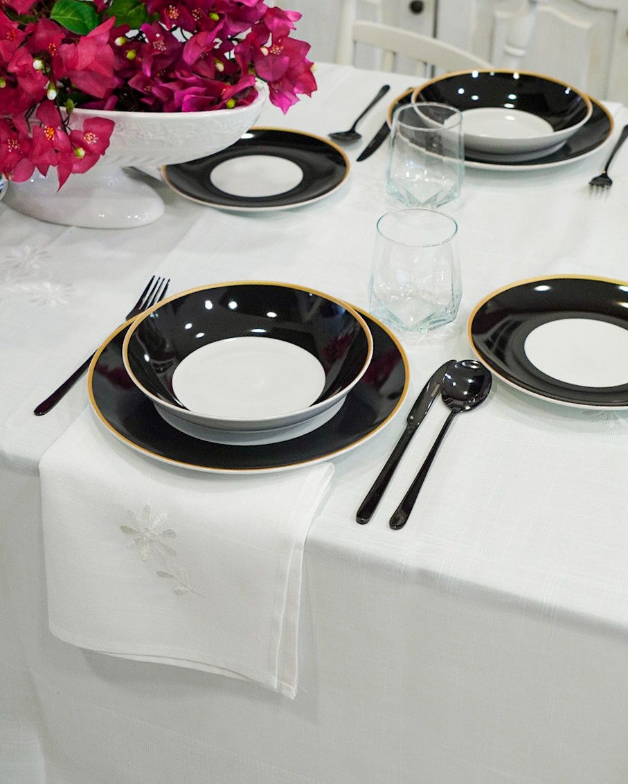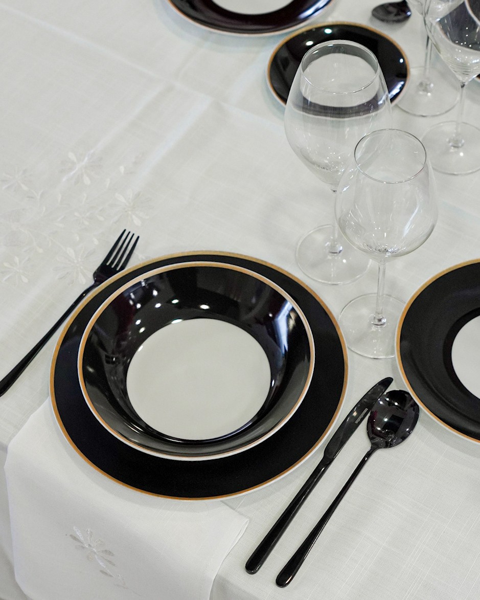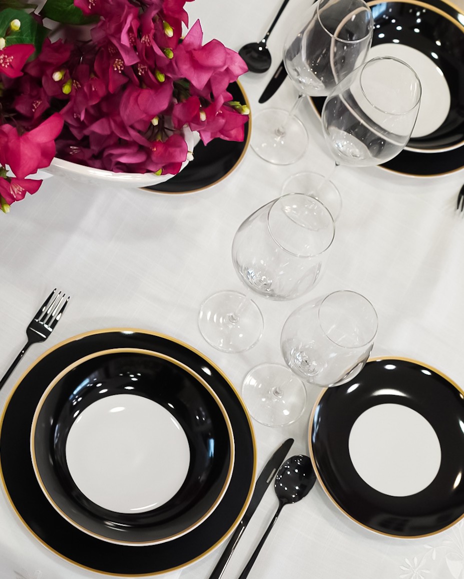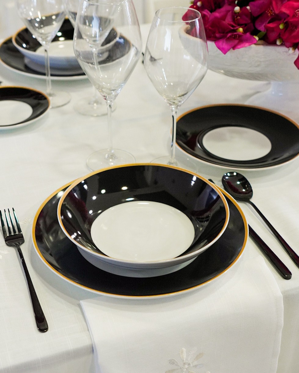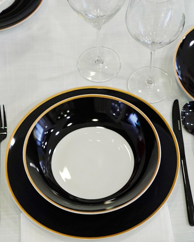 Servizio di piatti Onyx in porcellana fascia colore nero e bordino dorato. Con stile e con un pizzico di estrosità viene proposto l’accostamento dell’oro con il nero, un accoppiata raffinata e chic.
