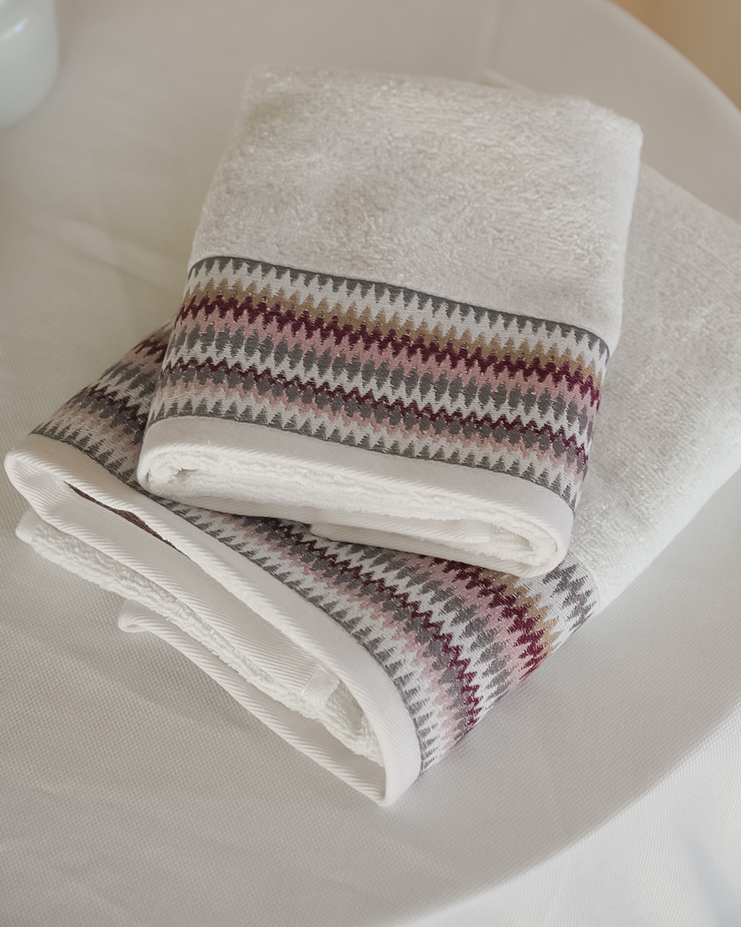 Di base tinta unita (430 gr/mq) con banda ricamata con motivo geometrico.