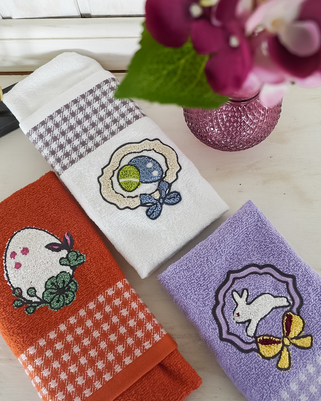 Set strofinacci in 100% puro cotone idrofilo arricchiti da simpatiche applicazioni ricamate tema pasquale. Confezione da 3 pezzi.