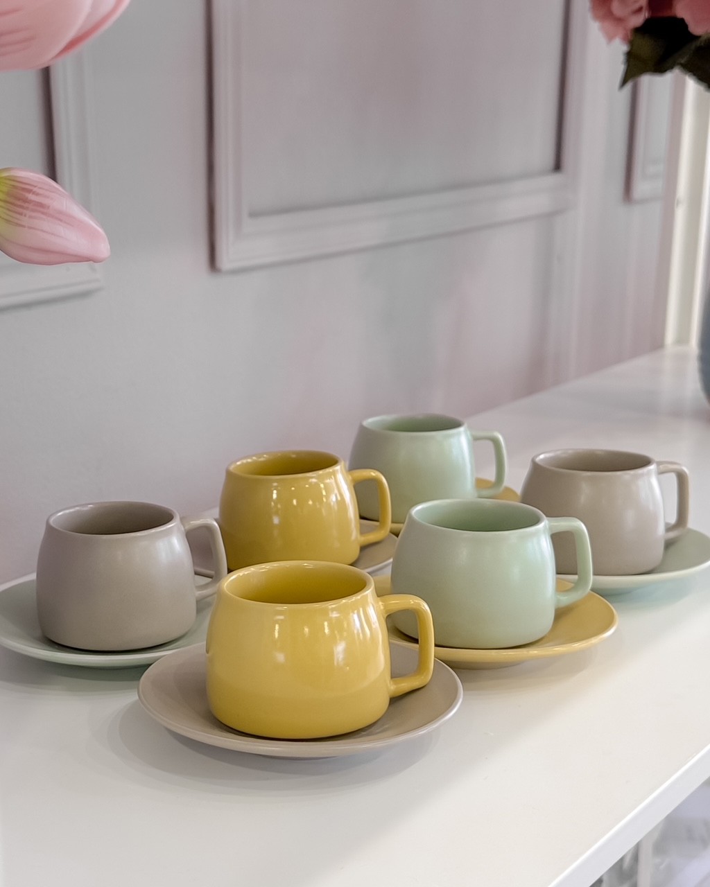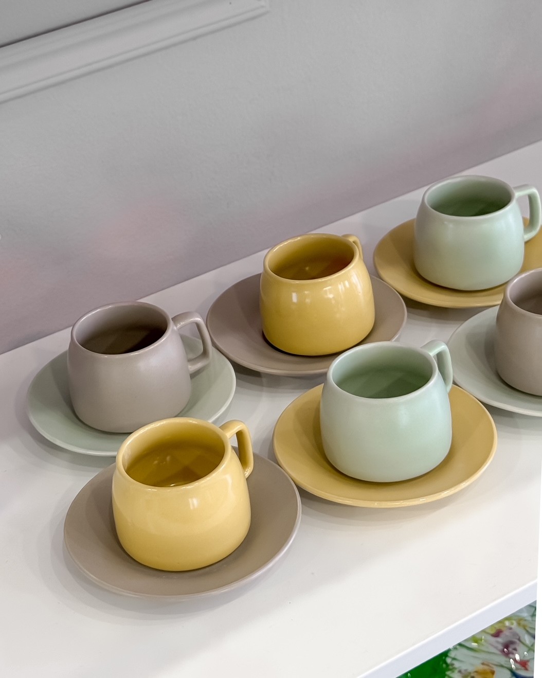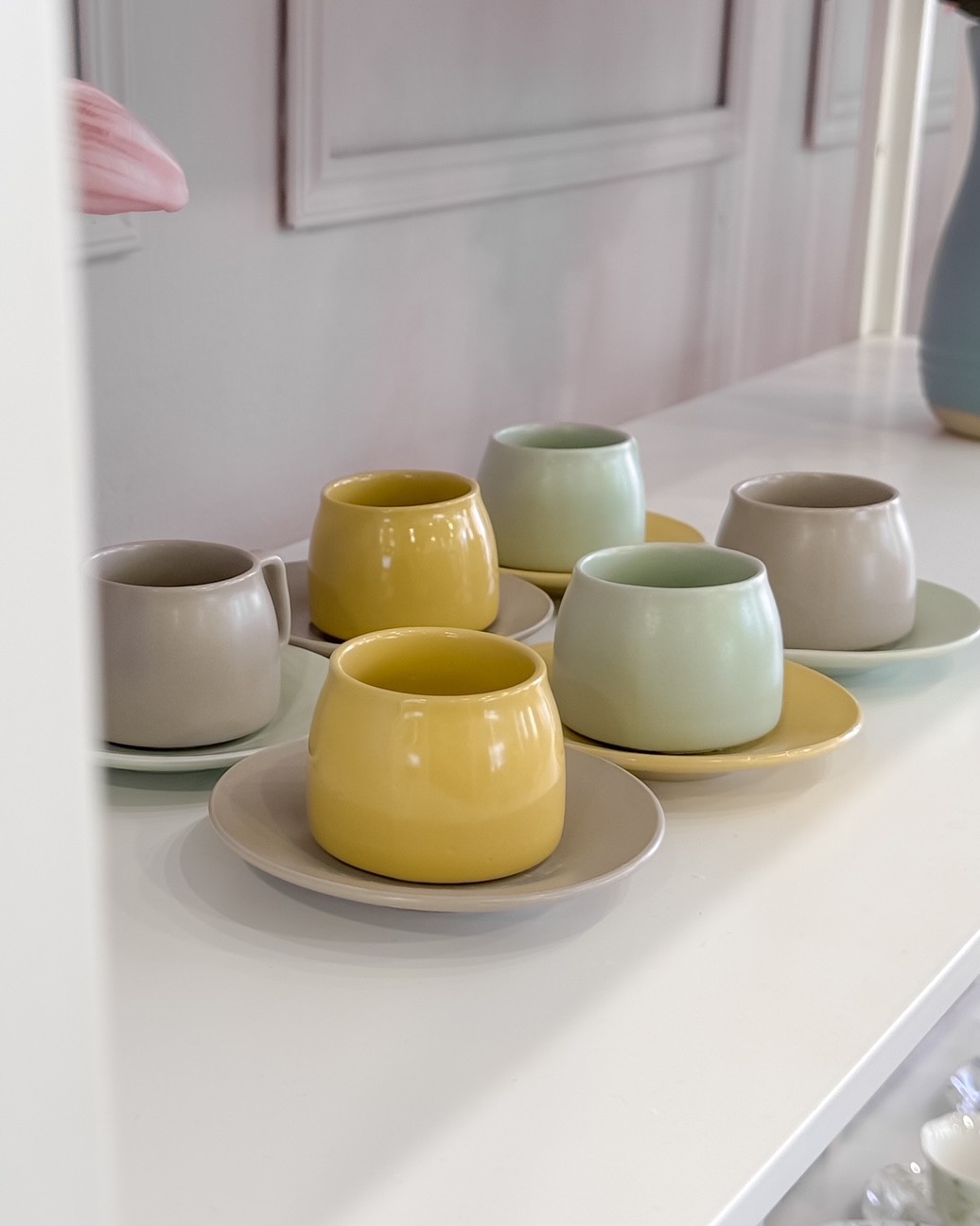 Il servizio include sei tazzine con piattini coordinati, perfetti per creare un’atmosfera vivace e accogliente. Le tazzine sono in 3 colori come i piattini, belli anche mescolando ii colori tra loro