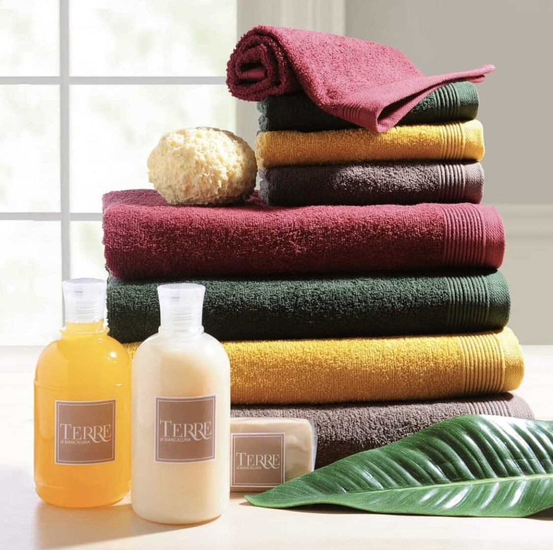 Set asciugamani in spugna, viso e ospite, della collezione Terre di Biancaluna.