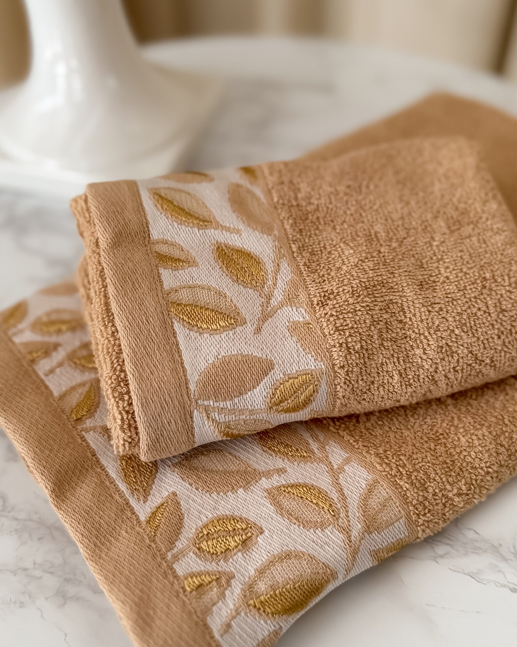 Di base tinta unita (430 gr/mq) con banda ricamata con motivi a foglie e impunture di cotone colorato, che aumentano la sensazione tridimensionale delle foglie.