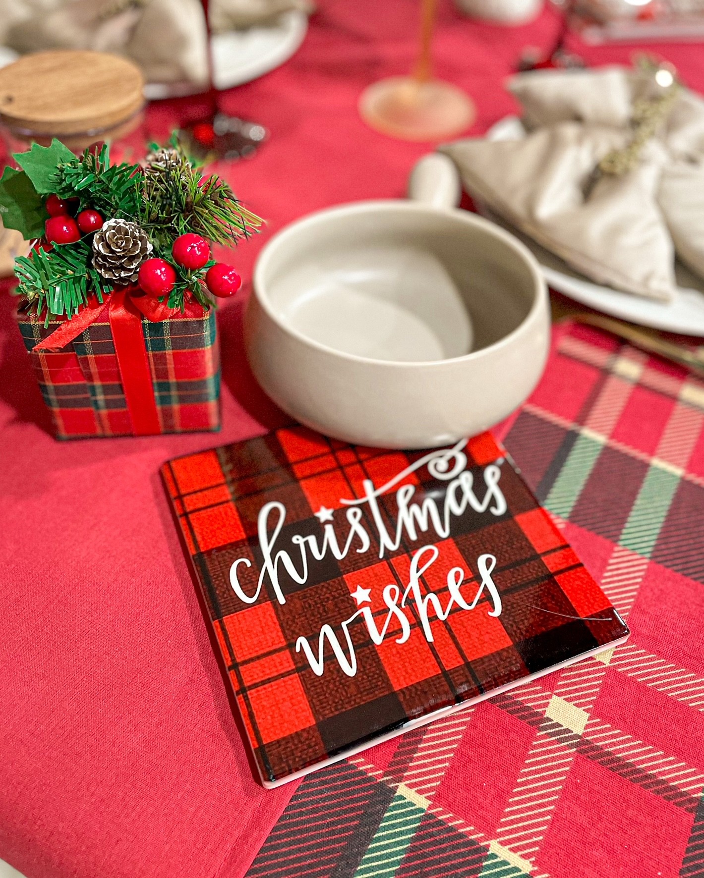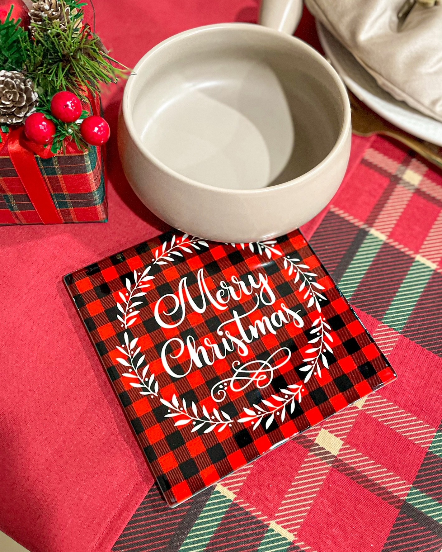 Sottopentola in ceramica con fantasie natalizie. Il sottopentola presenta una fantasia a quadri rossa e nera con scritta “Merry Christmas”, è disponibile in 4 differenti fantasie.
